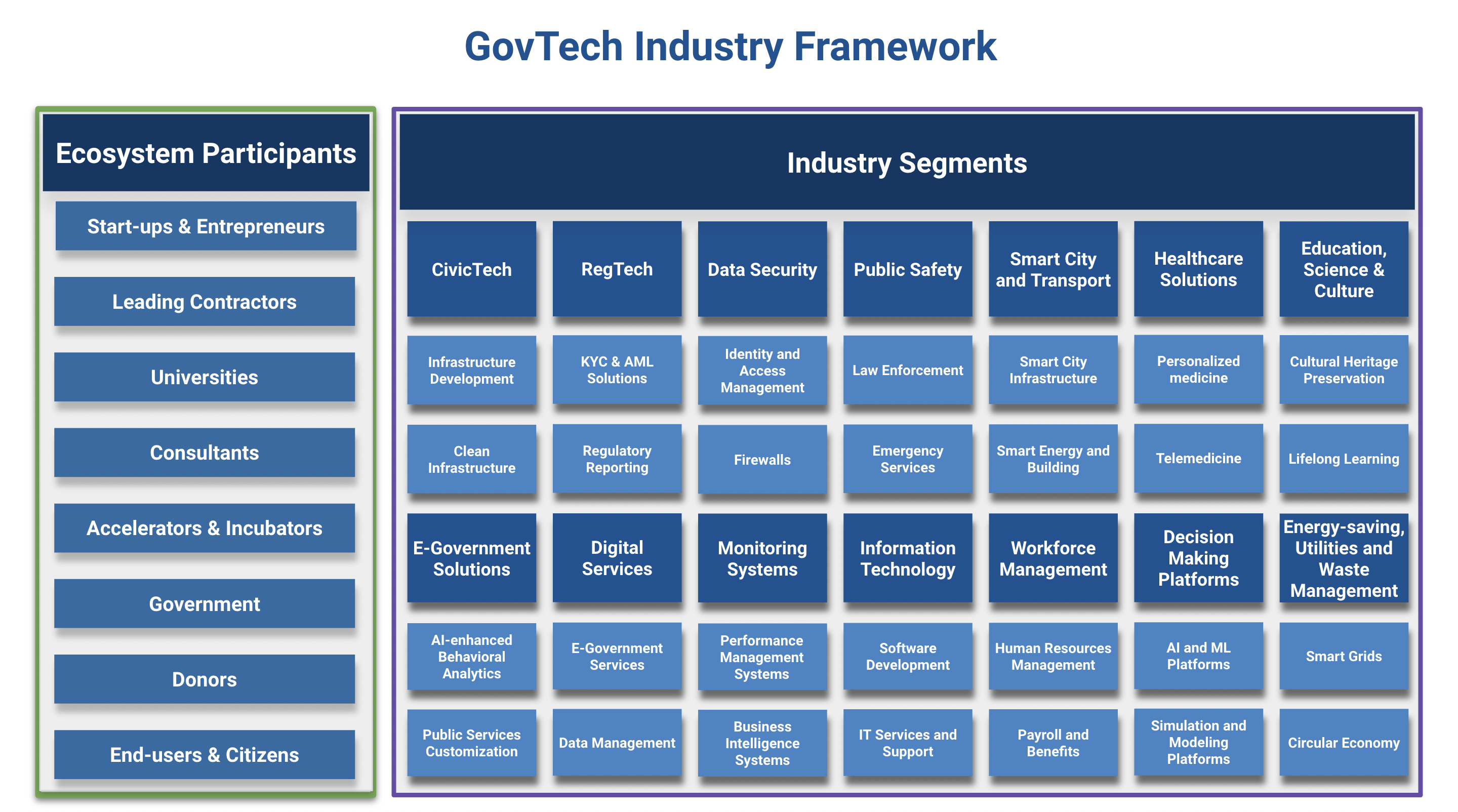 The GovTech Industry Analytical Framework identifies four key ecosystem groups within the industry, including: