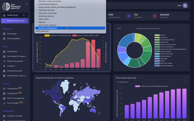 The GovTech Industry Big Data Analytics Dashboard is a powerful tool that leverages the comprehensive framework of the GovTech industry to provide unparalleled insights into the rapidly evolving government technology landscape. At the heart of this innovative platform lies the critical role that data plays in shaping policy decisions and driving innovation. Built on a foundation of extensive research and deep expertise in data science, the dashboard provides policymakers with the tools they need to analyze the entire industry, as well as quantitative parameters, in real-time.