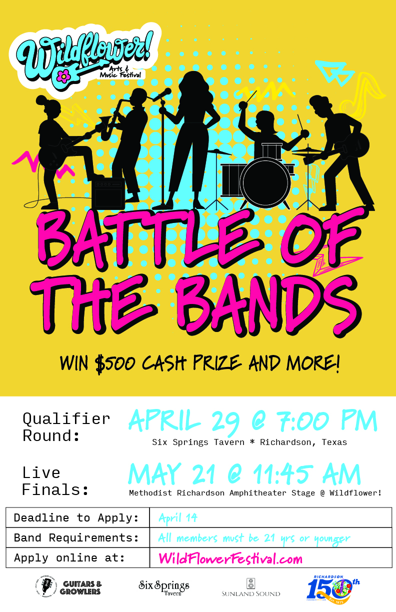 RICHARDSON, TX, USA, March 29, 2023/EINPresswire.com/ -- The Wildflower! Arts & Music Festival Battle of the Bands is set to rock at Six Springs Tavern in Richardson on April 29. The annual qualifier round showcases local and regional bands competing for a $500 cash prize and chance to perform live on the Methodist Richardson Amphitheater Stage on May 21. A panel of judges, including JackFM radio host JT Springer, will score and announce bands selected for the live final round.Past winners include The Kid Brothers (2022), Texas rocker Griffin Holtby with the Fifth Phoenix (2019) and Clio Cadence, formerly the lead singer of pop-rock Dallas-based band, Love Past Blue (2016). Wildflower! is a stepping stone for talented young musicians who’ve battled their way onto the big stage to perform in front of thousands of fans.
