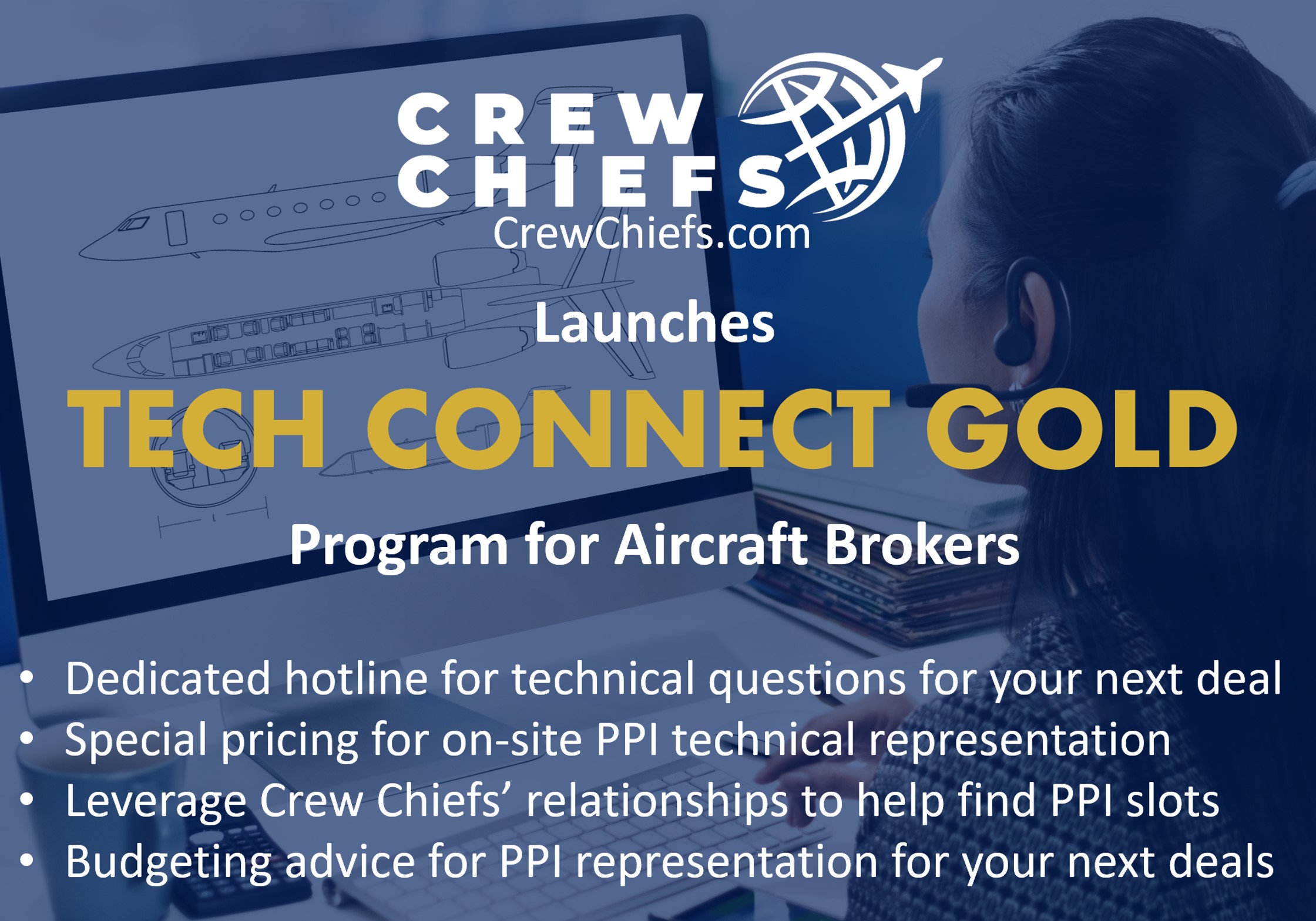 The TechConnect Gold program is a monthly retainer program that provides aircraft brokers access to 1) technical expertise, even before a client has decided to purchase or sell an aircraft, 2) better rates for Crew Chiefs’ on-site technical representation, 3) leveraging Crew Chiefs’ industry relationships to help find a PPI slot, and 4) budgeting support for PPI technical representation. Chris Buchholz, CEO of Crew Chiefs Corp said: “we launched the TechConnect Gold program to further support aircraft brokers even before the client has decided on a specific aircraft to ensure that they, and their clients, have access to a sounding board for technical issues to help them make more informed decisions”.