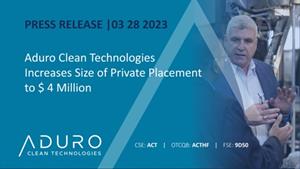 SARNIA, Ontario, 30 mars 2023 (GLOBE NEWSWIRE) -- Aduro Clean Technologies Inc. (« Aduro » ou la « Société ») (CSE : ACT) (OTCQB : ACTHF) (FSE : 9D50), développeur canadien de technologies brevetées à base d'eau pour le recyclage chimique des plastiques et la transformation du pétrole brut et des huiles renouvelables en matières premières et en combustibles de plus haute valeur, a le plaisir d'annoncer que, suite à son communiqué de presse daté du 8 mars 2023, il a monté son placement privé sans intermédiaire d'unités (les « Unités ») à 0,93 dollar par unité pour un produit brut d'un minimum de 1 999 965 dollars jusqu'à un maximum de 4 000 000 dollars (l'« Offre LIFE »).