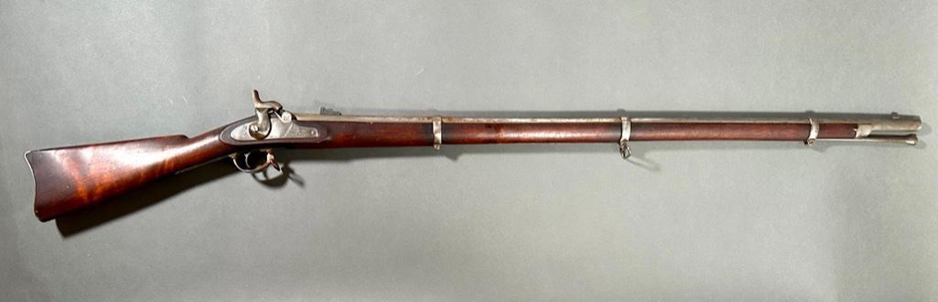 • An 1863 Colt Civil War contract rifle musket with an engraved side plate, percussion strike, steel ramrod and walnut stock with burl, stamped throughout, 55 ½ inches long (est. $2,000-$3,000).