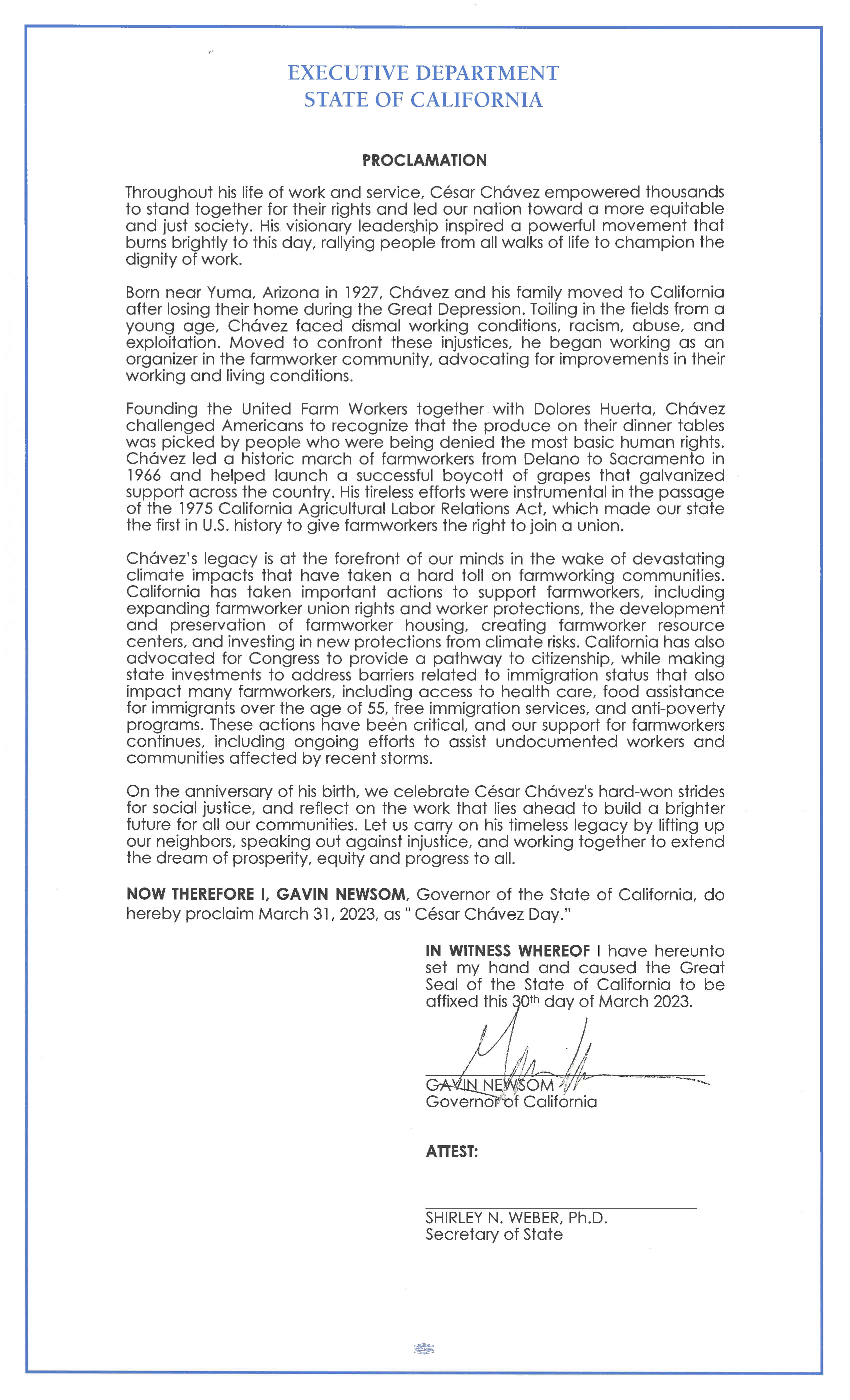 NOW THEREFORE I, GAVIN NEWSOM, Governor of the State of California, do hereby proclaim March 31, 2023, as ” César Chávez Day.”