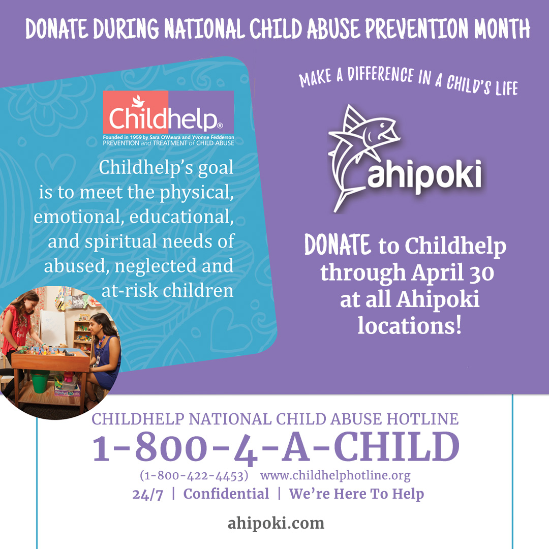 TEMPE, AZ, UNITED STATES, April 4, 2023/EINPresswire.com/ -- Ahipoki is proud to partner with Childhelp to raise funds for the prevention and treatment of child abuse in honor of Child Abuse Prevention Month this April. Customers can donate at any Ahipoki location across Arizona and California through April 30, 2023.“Childhelp is grateful for the ongoing partnership and commitment to preventing child abuse illustrated by Ahipoki and its customers. Their generosity demonstrates a strong belief in the impact of the Childhelp National Child Abuse Hotline, Speak Up Be Safe, and programs throughout Arizona and California. Thank you for bringing the light of love to National Child Abuse Prevention month!” said Steven Henderson, Senior Director of Development, Childhelp