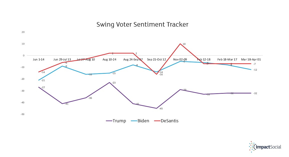 Impact Social is a specialist social media, online monitoring, and analysis company using big data software and human analysis to passively monitor organic public sentiment. Working from a football-stadium sized 40,000 voter focus group of swing voters across the political spectrum, Impact Social finds no movement for either DeSantis or Trump following Trump's indictment, and a slight drop for Biden.