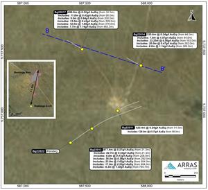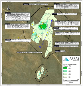 Tim Barry, CEO of Arras, commenting on these latest results stated, “Our drilling on the Beskauga Project has continued to produce long intercepts of continuous copper-gold mineralization starting at a depth of 40 meters below the surface. Our recent drilling has demonstrated the continuity of the mineralization to over one kilometer of vertical depth and has defined a high-grade zone that dips to the SSW. Mineralization remains open both laterally and at depth and suggests that the Beskauga ore body is much larger than has been recognized in the NI43-101 report.”