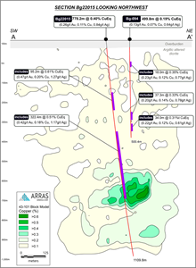 Figure 3. Cross-section showing drill holes Bg22015 in relation to historical drill hole Bg-094. Also shown are grade contours based on the Beskauga block model for copper (only) developed for the purposes of the current Mineral Resource Estimate for Beskauga (for further details, please see Arras’ press release on June 20, 2022). CuEq grades of key intercepts in Bg22015 and historical holes are shown. The cross-section demonstrates the steep dipping high-grade copper-gold-silver trend observed through Arras’ exploration to date. This trend is observed beginning at the paleo-bedrock surface (41 m in depth) and averages between 200-300 m wide and to be consistently mineralized down to at least 1000 meters.