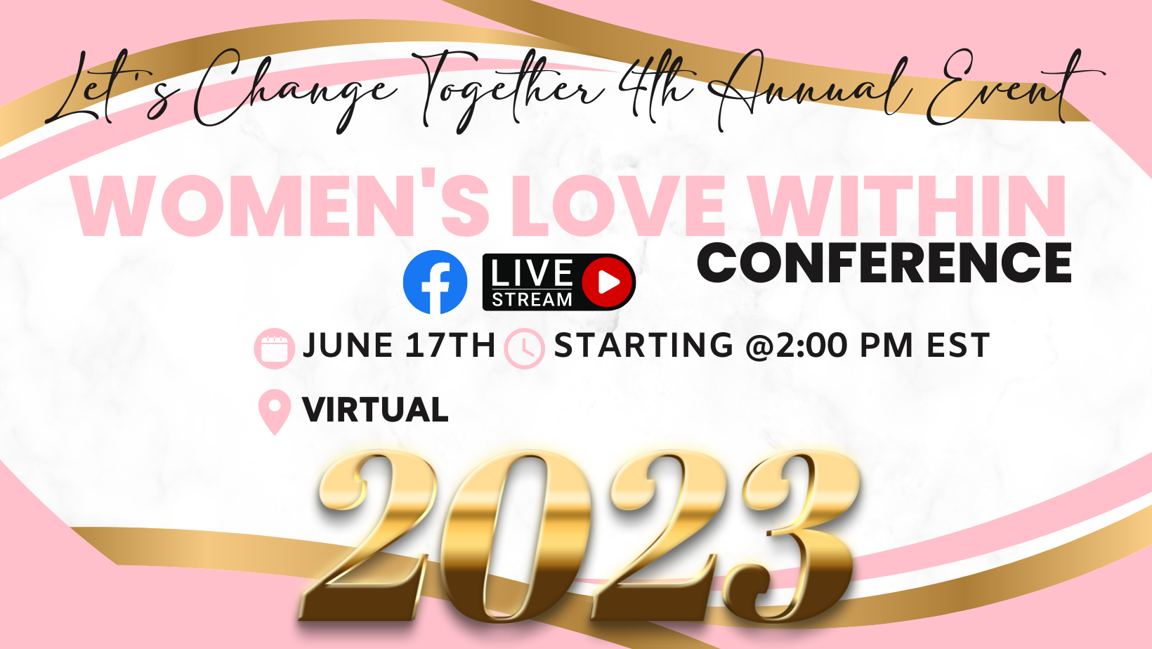 VIRTUAL, FLORIDA, UNITED STATES, April 6, 2023/EINPresswire.com/ -- Let's Change Together Announces Women's Love Within Virtual Annual Event 2023Let's Change Together, a global organization dedicated to empowering women, is proud to announce its annual event for 2023: Women's Love Within. This virtual event will take place on June 17th and 18th starting at 2pm EST, 2023 and will feature inspiring speakers, gifts, and networking opportunities for women from around the world.