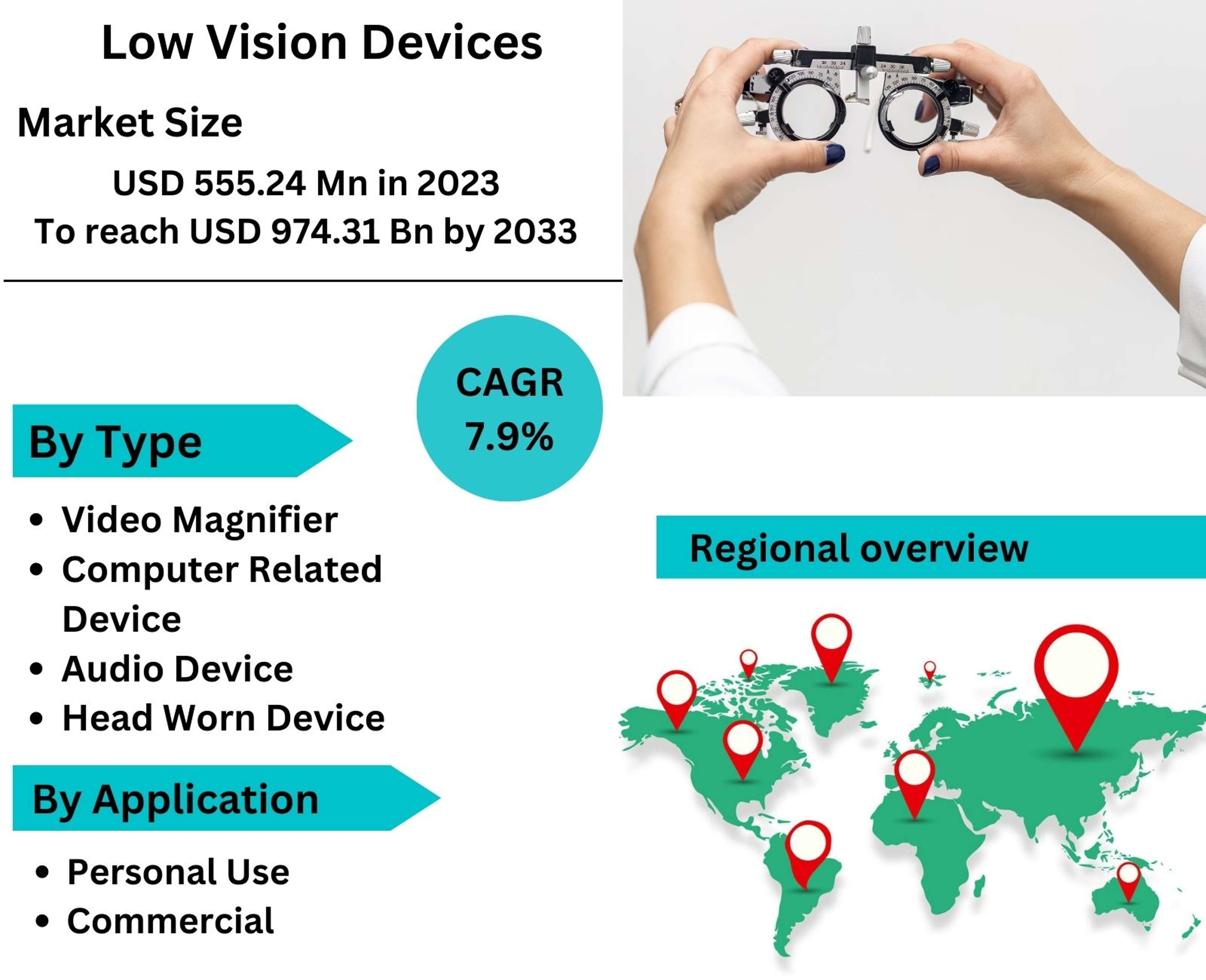 NEW YORK, NY, UNITED STATES, April 6, 2023 /EINPresswire.com/ -- The low vision devices market value is USD 555.24 million in 2023 is expected to reach USD 974.31 million by 2033 CAGR of 7.9% during the forecast period 2023 to 2033