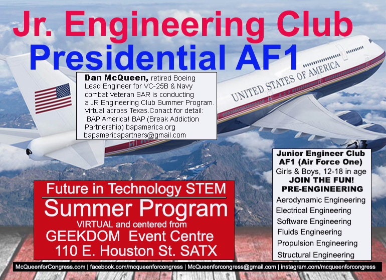 Dan McQueen, Candidate for U. S. Senate in Texas has launched a BAP American program of S.T.E.M. around a Virtual Junior Engineering Club, Air Force One.
