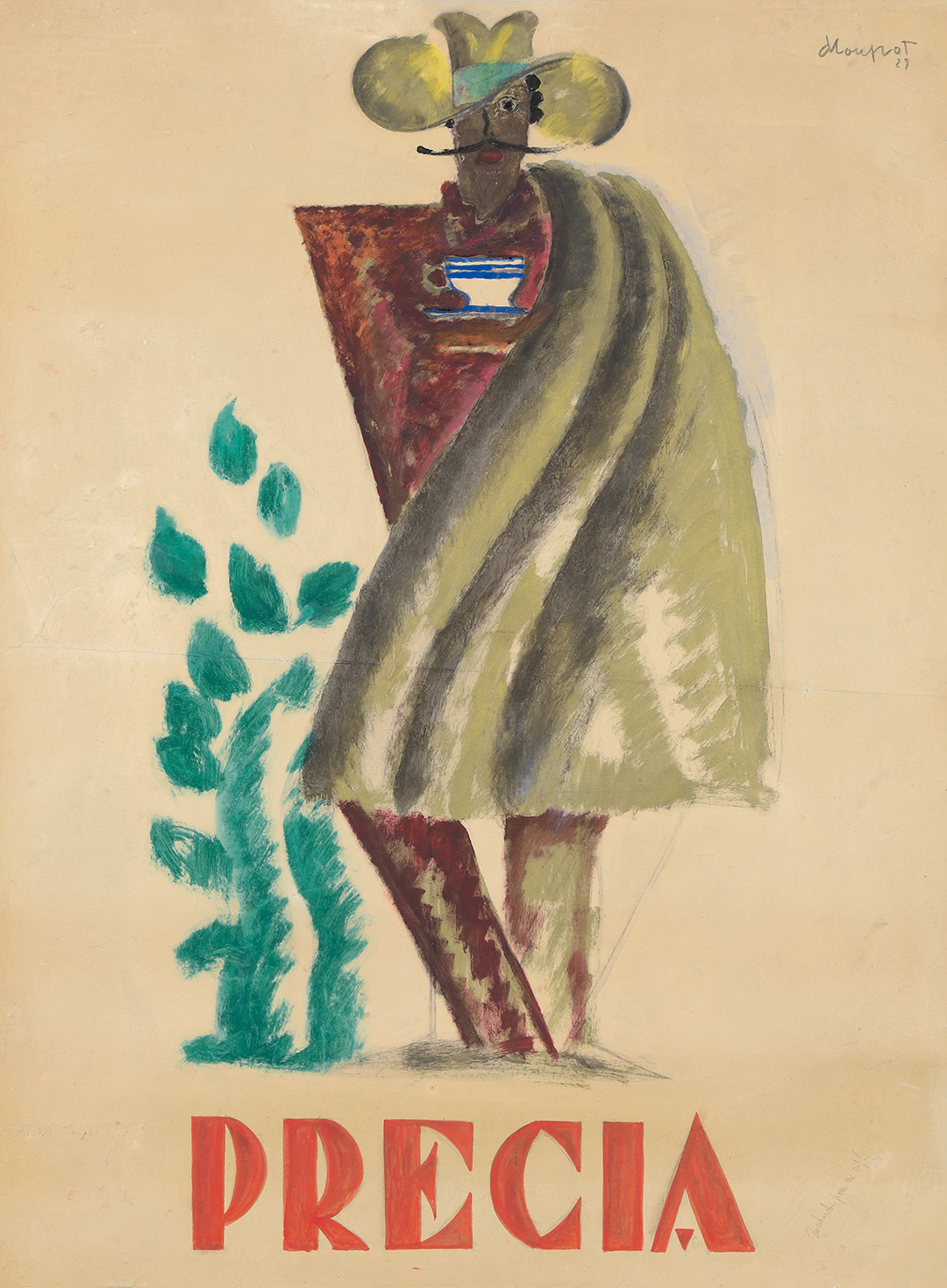 Fans of Art Deco had plenty of top posters to bid on. Geo Ham’s Monaco Grand Prix 1933 was sold for $20,400 (est. $17,000-$20,000) and his Monaco / 22 Avril 1935 was won for $19,200 (est. $17,000-$20,000). Paul Colin’s esteemed 1929 portfolio, Le Tumulte Noir, was swept up for $36,000. From Charles Loupot, a 1929 maquette for Café Precia wowed bidders, resulting in a win of $18,000 (est. $8,000-$10,000). A. M. Cassandre’s renowned 1938 Normandie / 60 Voyages sailed away with a top bid of $13,200 (est. $7,000-$9,000), while Carl Moos’ stylish ca. 1917 Paul Rückmar strutted its way to a win of $8,400 (est. $7,000-$9,000).