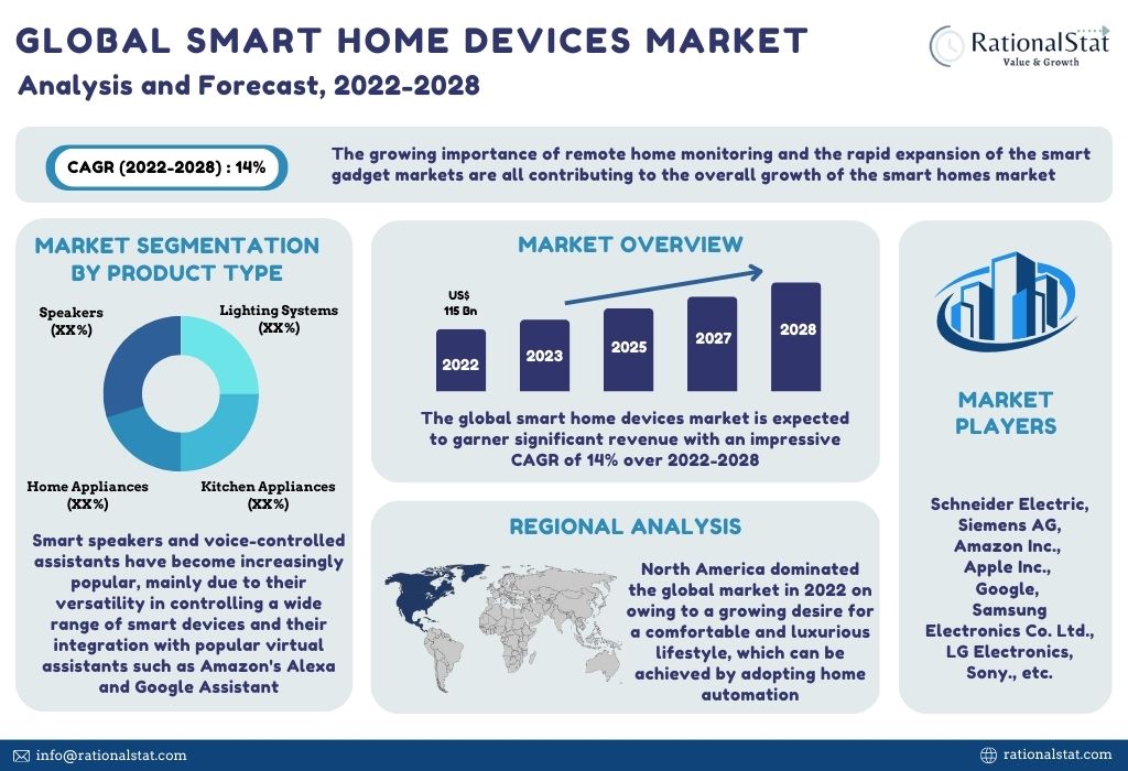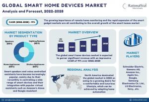 WILMINGTON, DELAWARE, UNITED STATES, April 11, 2023/EINPresswire.com/ -- The major factors driving the growth of the global smart home devices market are the rising need for home security coupled with the need for remote monitoring, which are expected to bolster the growth of the market says a research report by RationalStatThe “Global Smart Home Devices Market Analysis and Forecast, 2019-2028” report by RationalStat assesses the regional market based on product, technology, sales channel, application, and region. A detailed market analysis report provides an overall historical and future market size in terms of market value (US$ Million) and market volume (‘000 units) with a comprehensive market trend analysis (year-on-year growth). In addition, the report outlines the market share analysis, growth of the smart home devices, an overview of the competition, strategic imperatives, plans and strategies, price points, potential growth drivers, recent R&D of smart home devices across the globe, and competition analysis for the target players evaluated in the global smart home devices market study.