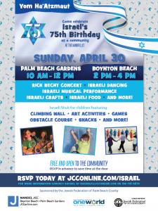 Yom Ha’Atzmaut is Israeli Independence Day, a day of great celebration, held every year. The 75th Anniversary of Israel’s declaration of independence in 1948 will officially take place April 25-26, 2023. The event is sponsored by the Jewish Federation of Palm Beach County.