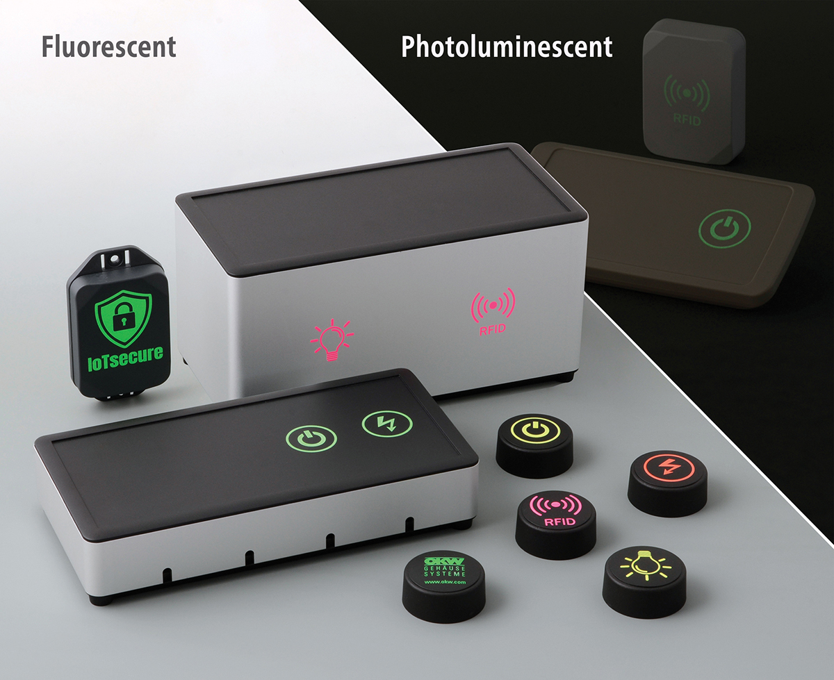 Customers can now specify OKW’s products with labels and graphics produced (by screen or tampo printing) using new fluorescent inks. These are ideal for warning messages or for attracting attention to equipment such as emergency electronics.