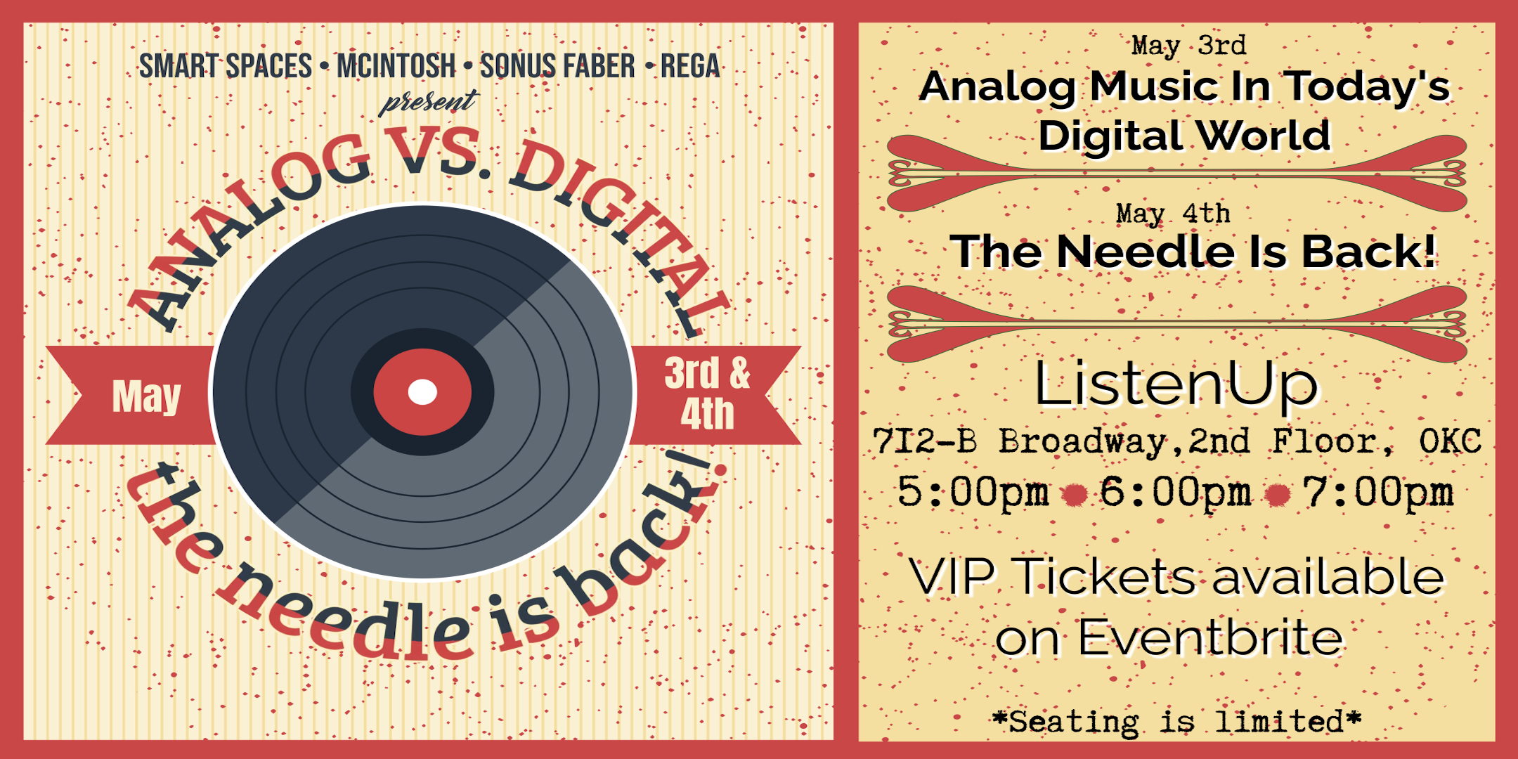 OKLAHOMA CITY, OK, USA, April 11, 2023/EINPresswire.com/ -- Smart Spaces, a BRAVAS affiliate, is excited to present two educational events titled “Analog Music in Today’s Digital World” on May 3rd and “The Needle is Back” on May 4th, at ListenUp OKC, located at 712-Broadway in Oklahoma City. The event is sponsored by industry leaders McIntosh and Sonus faber. “Analog Music in Today’s Digital World,” will explore how music sounds from Analog LPs and multiple digital formats. “The Needle is Back” will take a deep dive into the different types of turn tables with comparative demonstrations. The event is divided into three one-hour sessions beginning at 5PM, each offering a unique perspective on the topic.As vinyl continues to make a resurgence in the music industry, attendees will have the opportunity to learn from experts about the differences between analog and digital music, and how technology has changed the way we experience music. The event will feature product demonstrations and in-depth discussions about how to optimize sound quality for various formats.