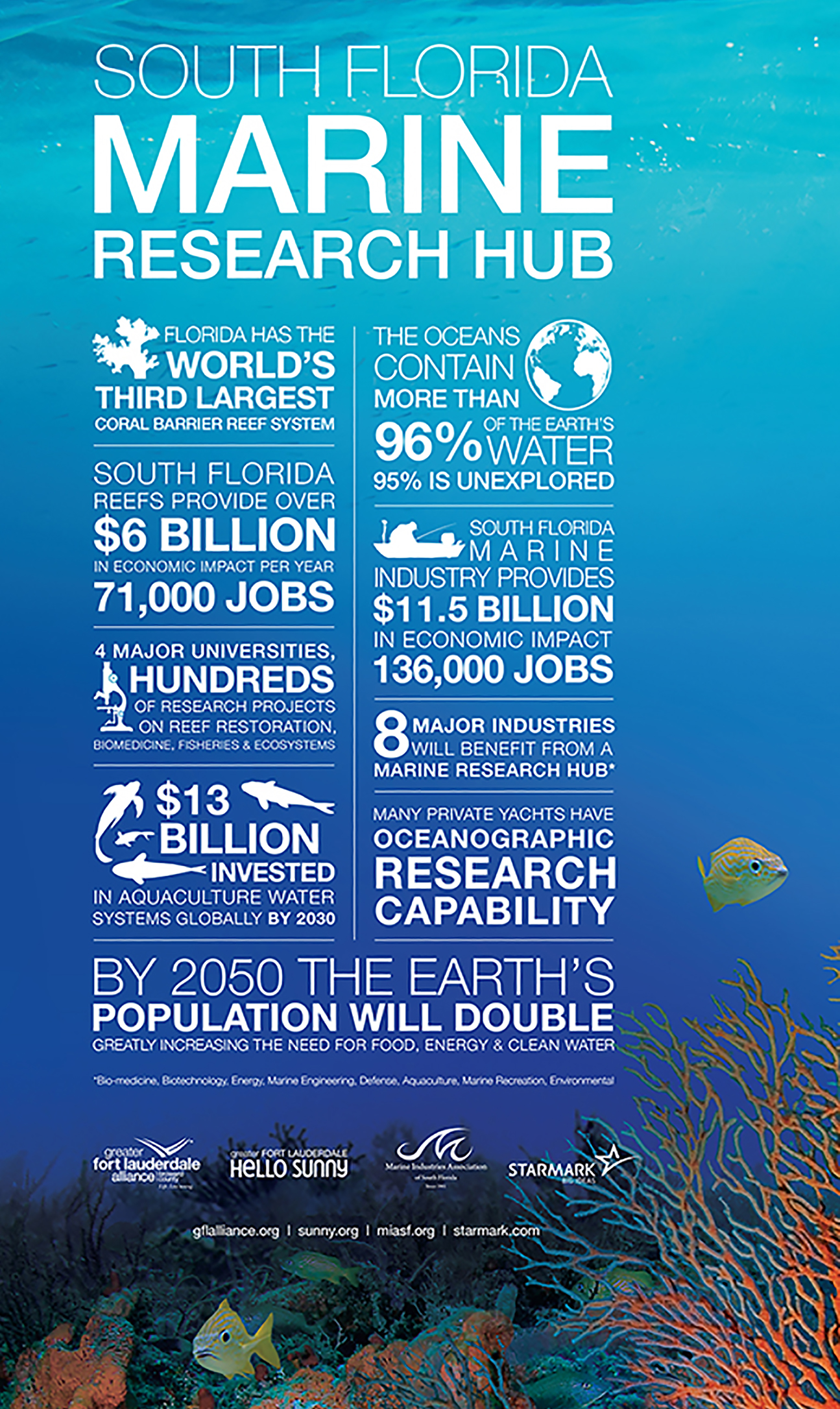 In 2017, the Marine Research Hub® Consortium was founded to foster collaboration among research, education, business, and economic development organizations. A 501(c)(3), MRH establishes the region as a global leader in oceanographic research, while helping to commercialize and monetize the research securing a leadership position in the Blue Economy. Founding members of the Marine Research Hub unified in a memo of understanding, include Florida Atlantic University, Florida International University, Nova Southeastern University, University of Miami, Business Development Board of Palm Beach County, Greater Fort Lauderdale Alliance, Miami-Dade Beacon Council and Marine Industries Association of South Florida. To learn more, visit www.marineresearchhub.org