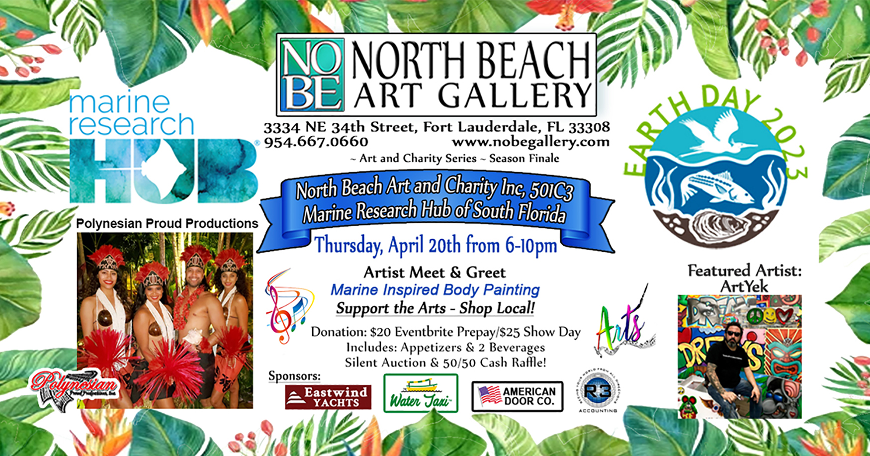 Aloha evening Earth Day Celebration supporting Marine Research Hub of South Florida & North Beach Art and Charity 501C3 with entertainment by Polynesian Proud.
