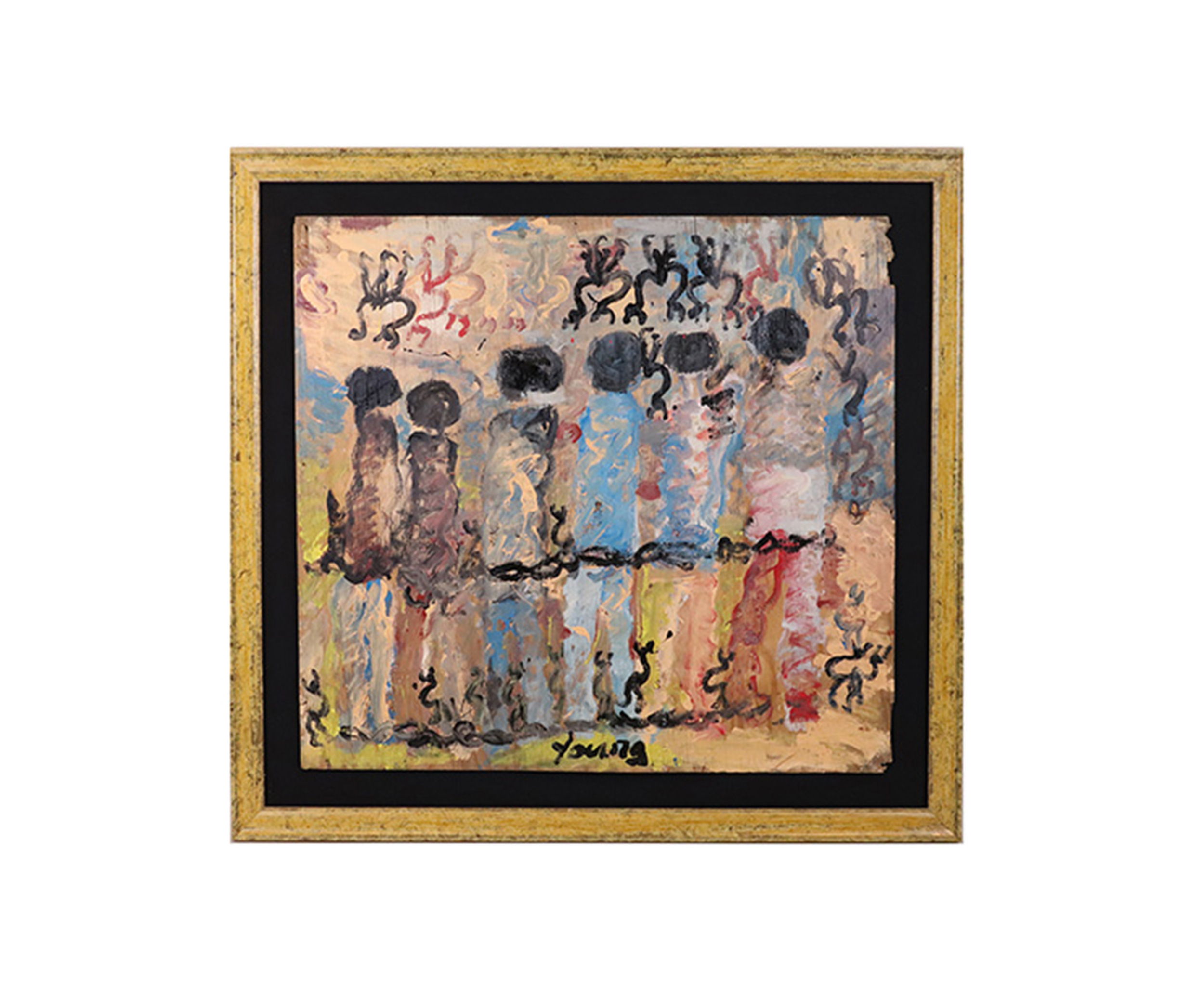 Continuing around the globe is a work by the Chinese artist, Yin Jun, titled Crying Girl (2006). The work is boldly colored and offers the viewer a terrific modern interpretation of a Pop Art portrait of a young girl. There are also three works by the noted self-taught artist Purvis Young. Most are larger than his typical works and are elaborate depictions of figures, heads and trucks.