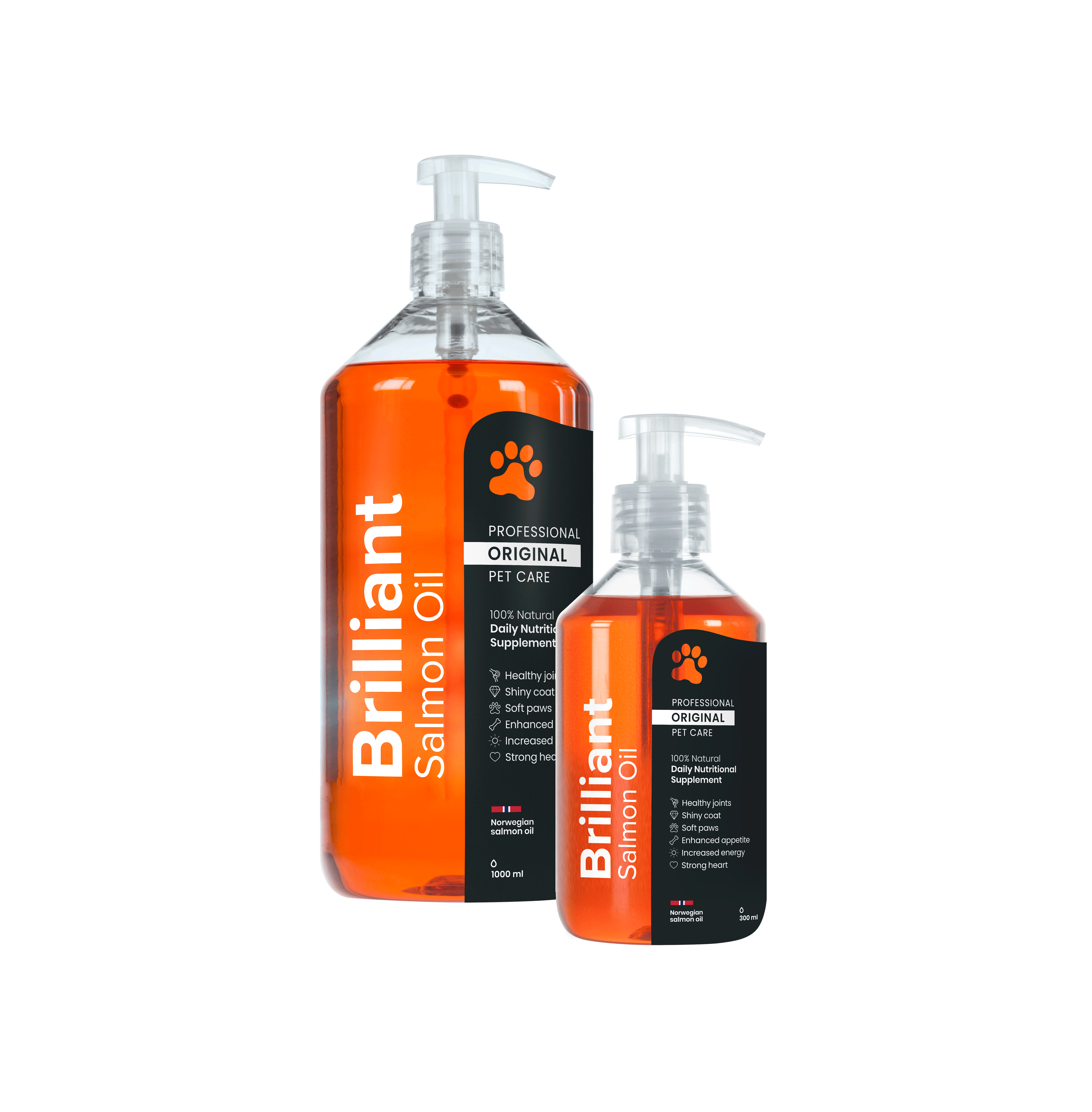 Brilliant uses fresh salmon from traceable origins. The product is processed from fish to the bottle within 4 hours. The final product is 100% pure and smells fresh, thanks to the high salmon sourcing standards. The salmon is locally grown and passes through a short process to liberate the salmon oil.