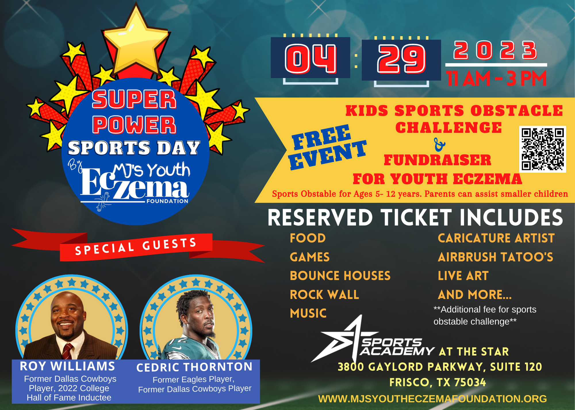 FRISCO, TEXAS, UNITED STATES, April 14, 2023/EINPresswire.com/ -- Super Power Sports Day & Fundraiser to benefit MJ’s Eczema Foundation and assist families impacted by youth eczema.MJ’s Youth Eczema Foundation, non-profit organization designed to assist sufferers of Youth Eczema and their families, today announced that former Dallas Cowboy and Oklahoma University (OU) football star and recent College Football Hall of Fame inductee Roy Williams will be participating in a fundraiser at the Sports Academy at the Star in Frisco, Texas on April 29th from 11 am – 3 pm. The sports challenge, which will be hosted by former Dallas Cowboy and Philadelphia Eagles professional football player Cedric Thornton and other former pro athletes, will benefit Youth Eczema, a disease that affects nearly 10 million children.
