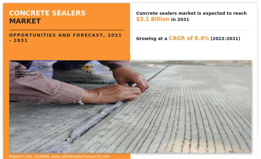 PORTLAND, OREGON, UNITED STATES, April 18, 2023 /EINPresswire.com/ -- The global concrete sealers industry generated $1.7 billion in 2021, and is estimated to reach $3.1 billion by 2031, witnessing a CAGR of 6.4% from 2022 to 2031.