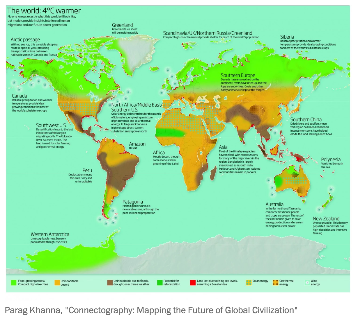5. Abrupt permafrost thawing is accelerating at a rapid rate. Scientists call it a potential Eco-Bomb; if just part of the 1400 Gigatons (1 Gigaton = 1000 billion tons) that is currently trapped in the frozen tundra of Russia’s Siberia, Alaska, Canada and the Antarctic with an additional 60 billion tons of frozen Methane located in the shallow seas around the world, even a small percentage of the total amount of Methane released into the atmosphere could quickly spike up temperatures to beyond humans’ ability to survive. which is somewhere between 8 to 12 degrees Fahrenheit. on average hotter.