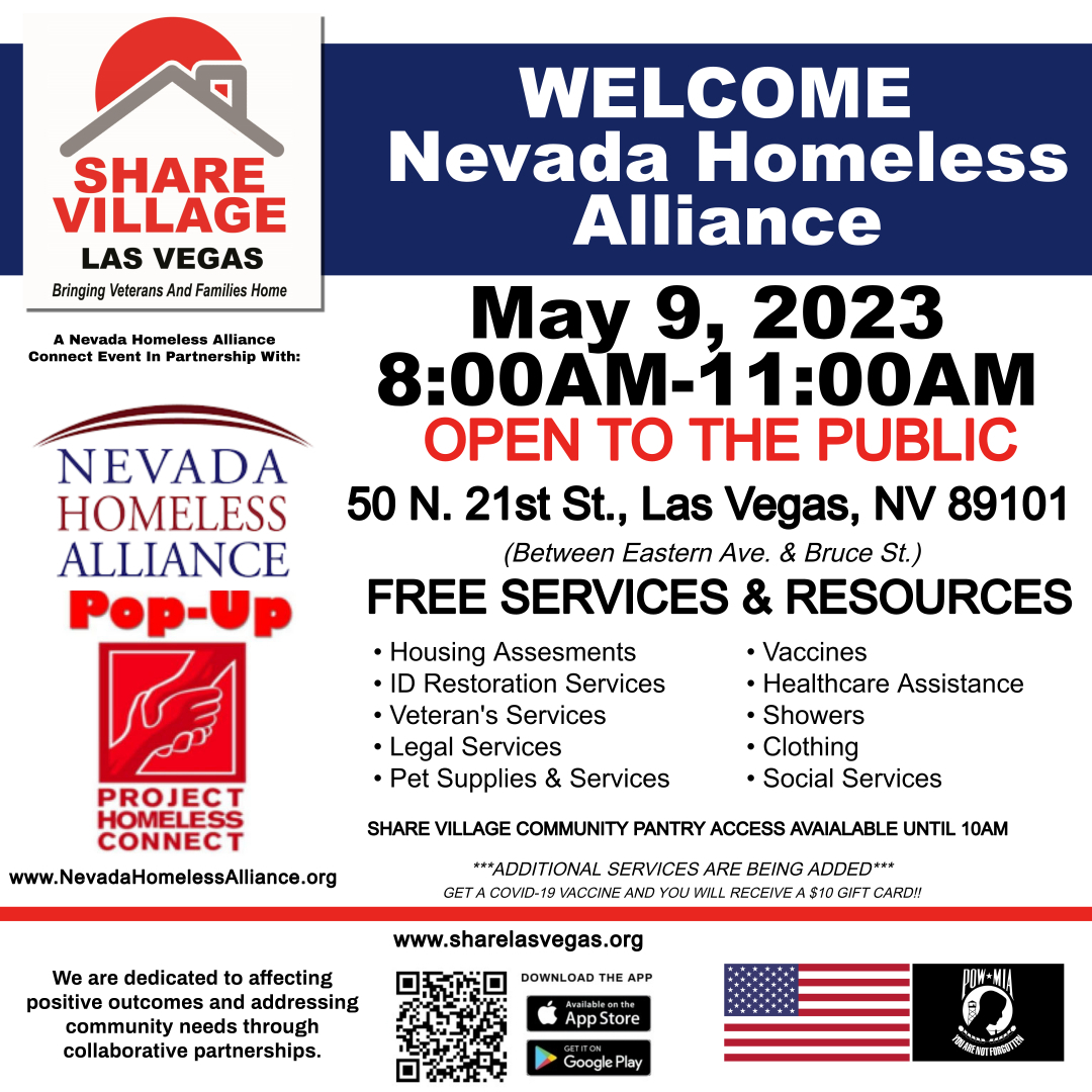 The Pop-up Project Homeless Connect event will take place on Tuesday, May 9th from 8am – 11:00am with pantry access available from 8:00am until 10:00am at the SHARE Village Las Vegas Main Campus located at 50 N. 21st St., Las Vegas, NV 89101.