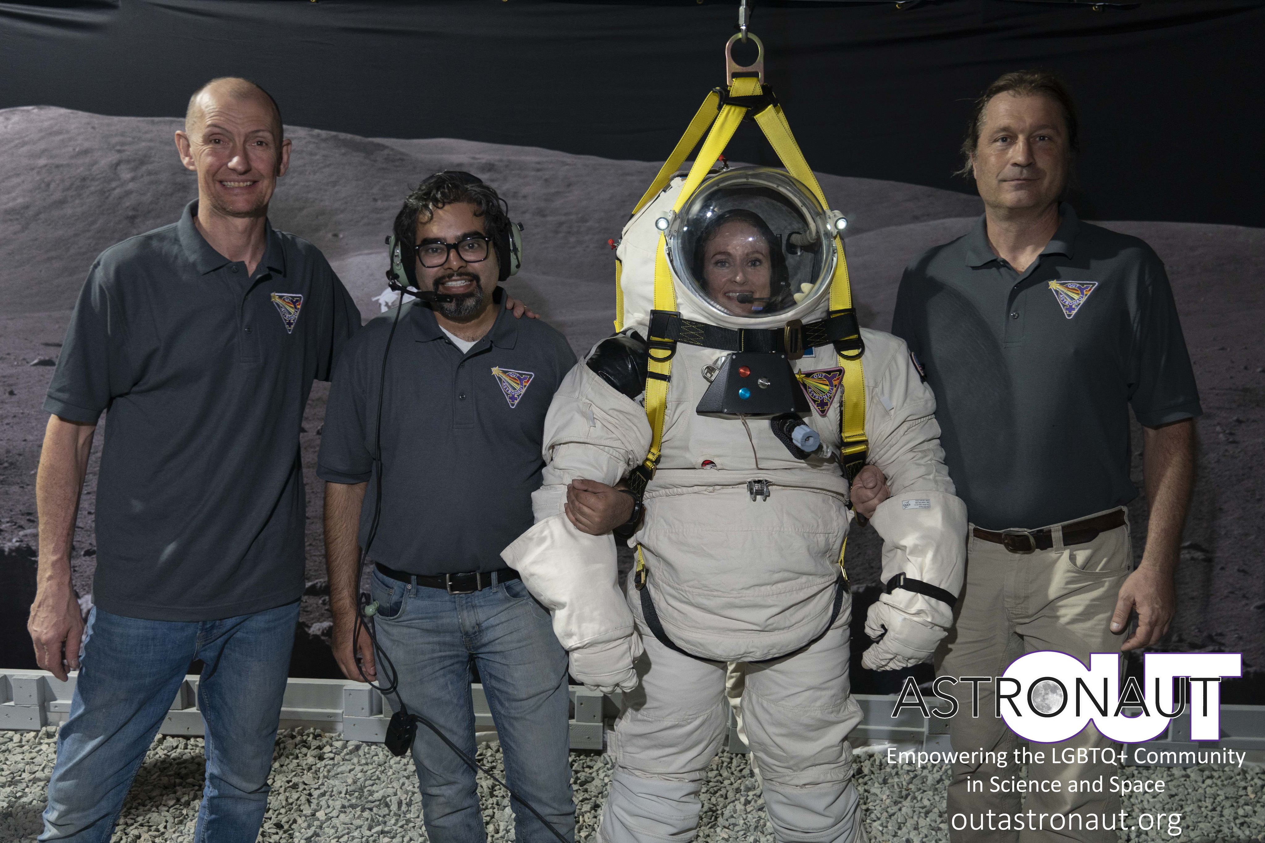 Out Astronaut member Brandy Nunez concludes an evaluation of a novel EVA space suit in simulated lunar gravity by planting an LGBTQ+ Pride Flag in the lunar regolith simulant. The flag serves to provide visibility and representation to LGBTQ+ individuals
