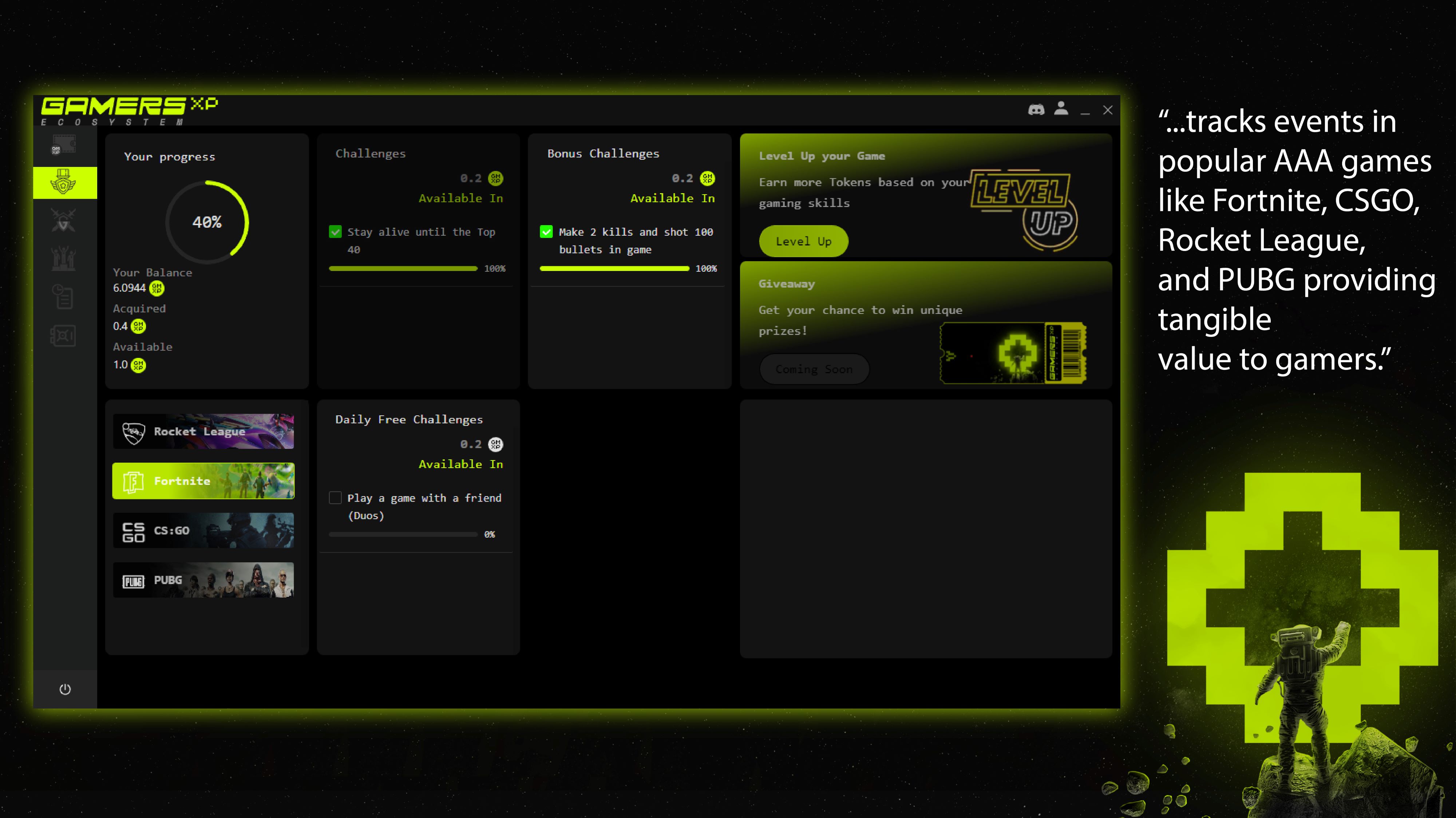 This desktop Windows application tracks events in popular AAA games like Fortnite, CSGO, Rocket League, and PUBG providing tangible value to gamers. Players can earn tokens that are exchangeable for fiat currency and level up to earn even more rewards.