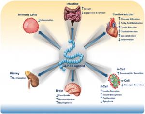 Glucagon-like peptide-1 (GLP-1) receptor agonists bind to GLP-1 receptors and activate it to stimulate physiological processes in the body.