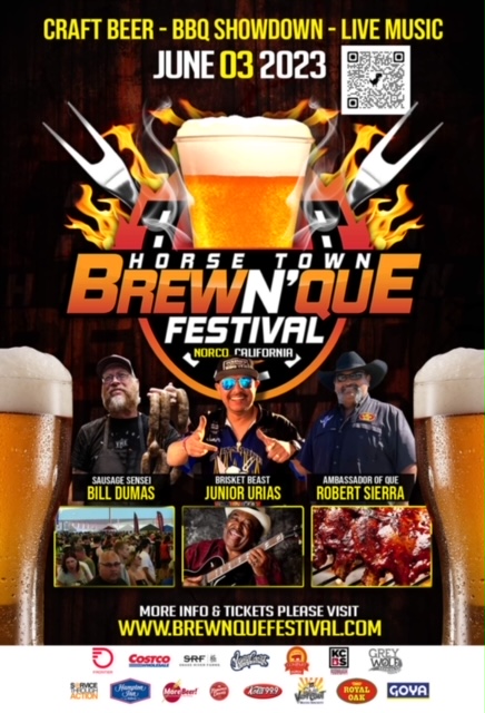 The 2023 Horse Town Brew N’ Que takes place Saturday, June 3, at George Ingalls Equestrian Event Center 3737 Crestview Drive, Norco, CA 92860 from 12am – 7pm to include BBQ Competition, Live Music, Brew sampling, demonstrations, special activities and more.