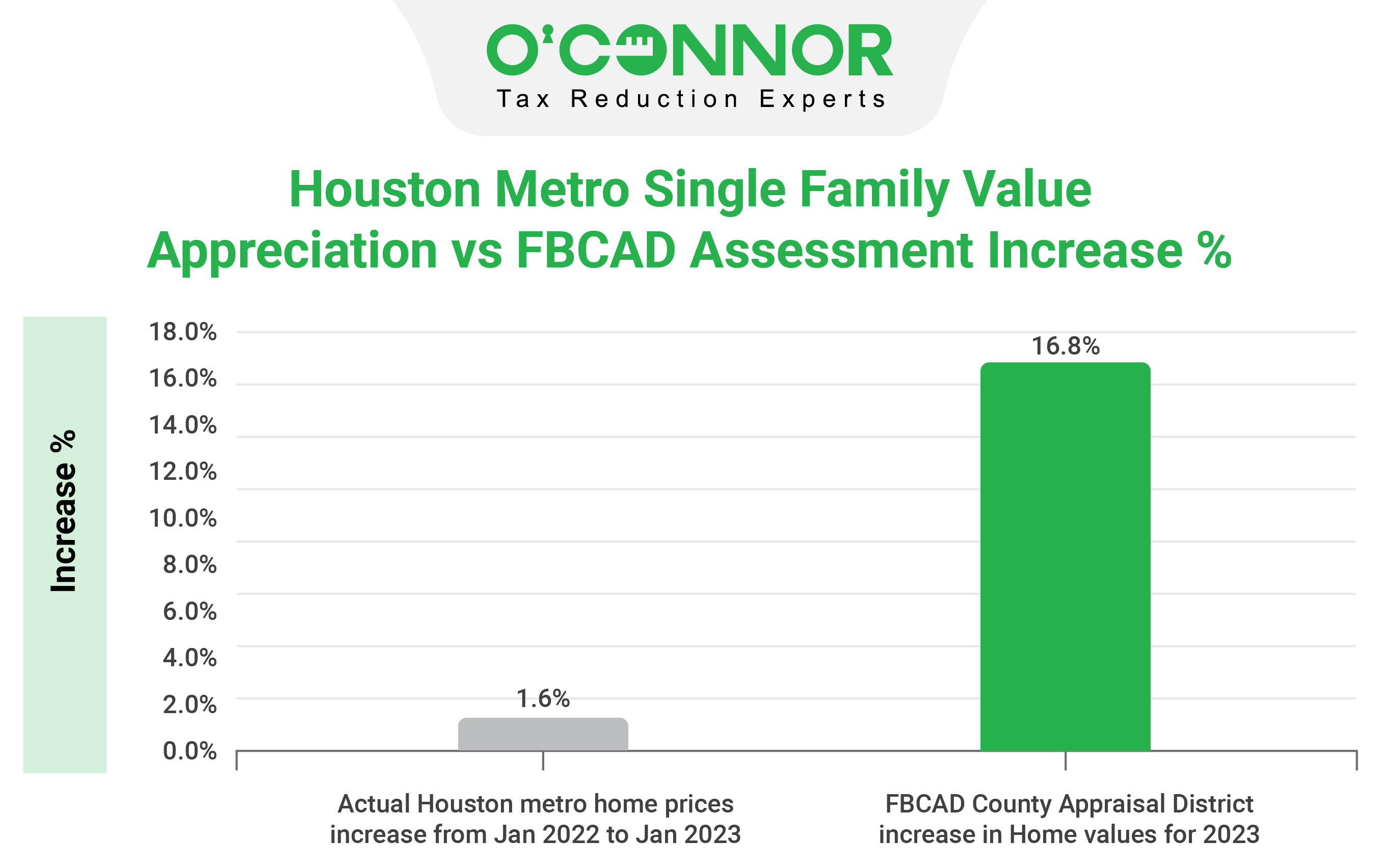 HOUSTON, TEXAS, UNITED STATES, April 25, 2023/EINPresswire.com/ -- Typical Fort Bend County homes are over-valued by over 8%. The Houston Association of Realtors® reports home values are up 1.6% from Jan 2022 to Jan 2023. However, Fort Bend property tax assessments have increased by 16.8%.A typical home is worth $370,442 but taxes are assessed at $402,442. This leaves a gap of $32,402 of phantom taxation. Fort Bend County homeowners will pay an additional $875 in 2023 property taxes based on over assessment, before considering tax protests and homestead exemptions.