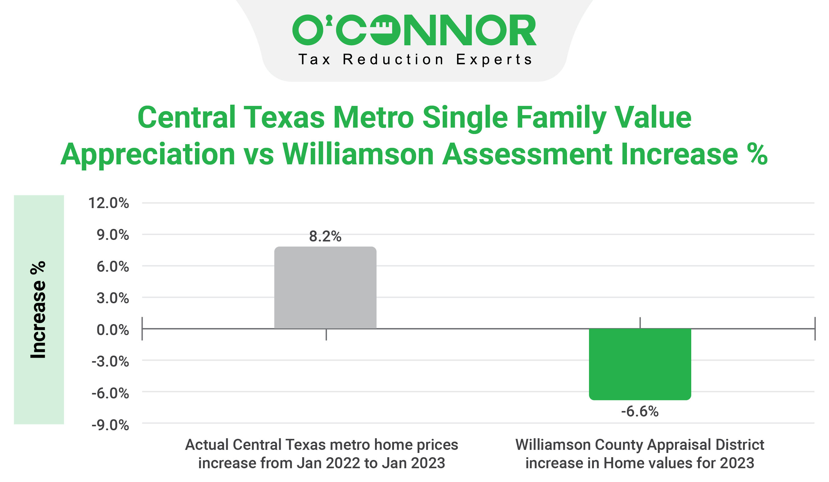 A study of January 2022 to January 2023 home sales by O’Connor, an expert in property tax consulting and appraisal services, revealed home sales prices rose 8.2% versus the 6.6% reduction in Williamson County values. In comparison, over 90% of houses in Harris County and Brazoria County are over-assessed based on a study of over 50,000 sales by O’Connor.