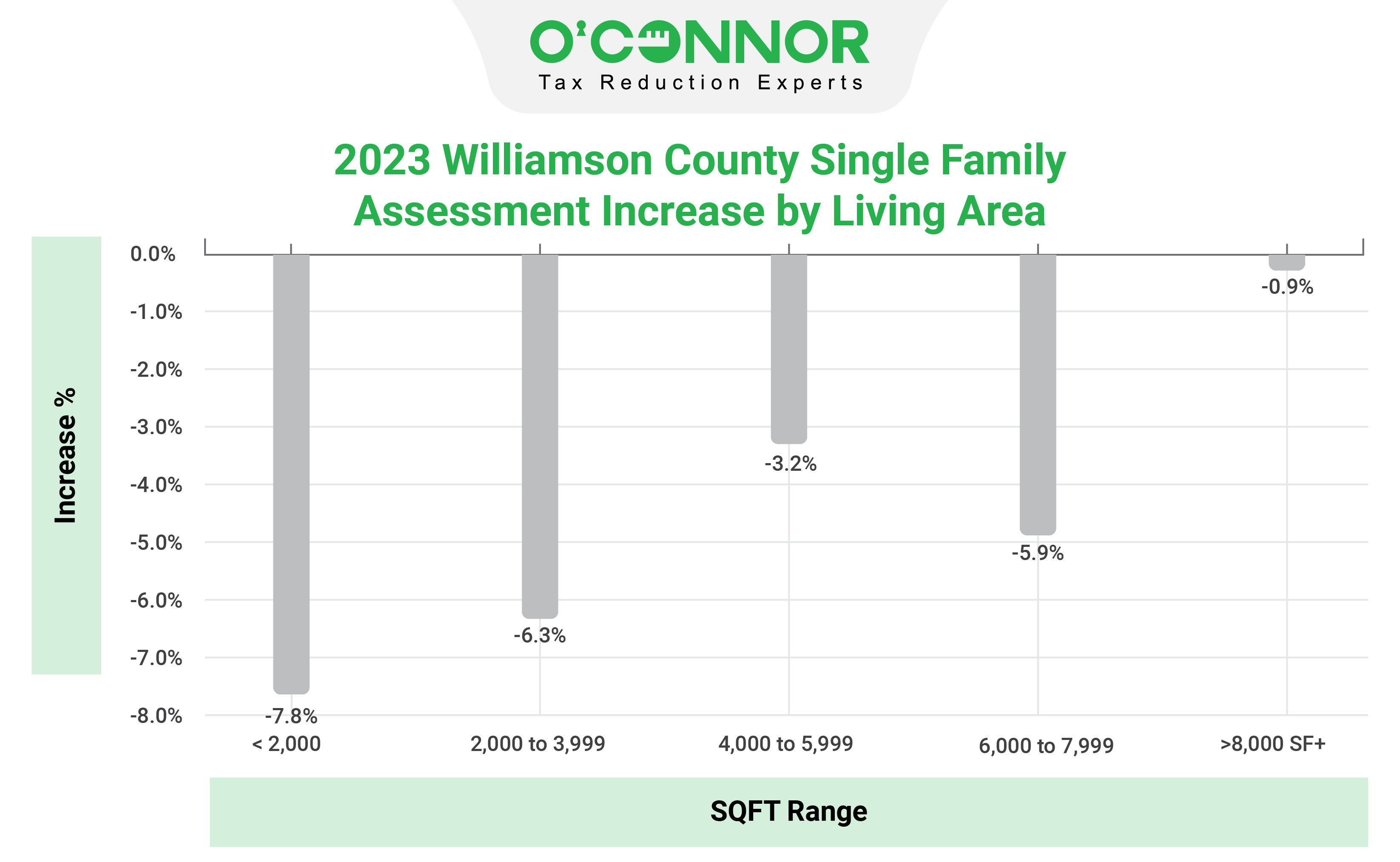 Most Williamson County residential property value ranges saw a reduction in assessment value. The exceptions, properties under $250K and properties over $1.5M, received relatively modest increases at 3.8% and 2.4% respectively. Williamson County residential property also decreased in assessed value across all home sizes.