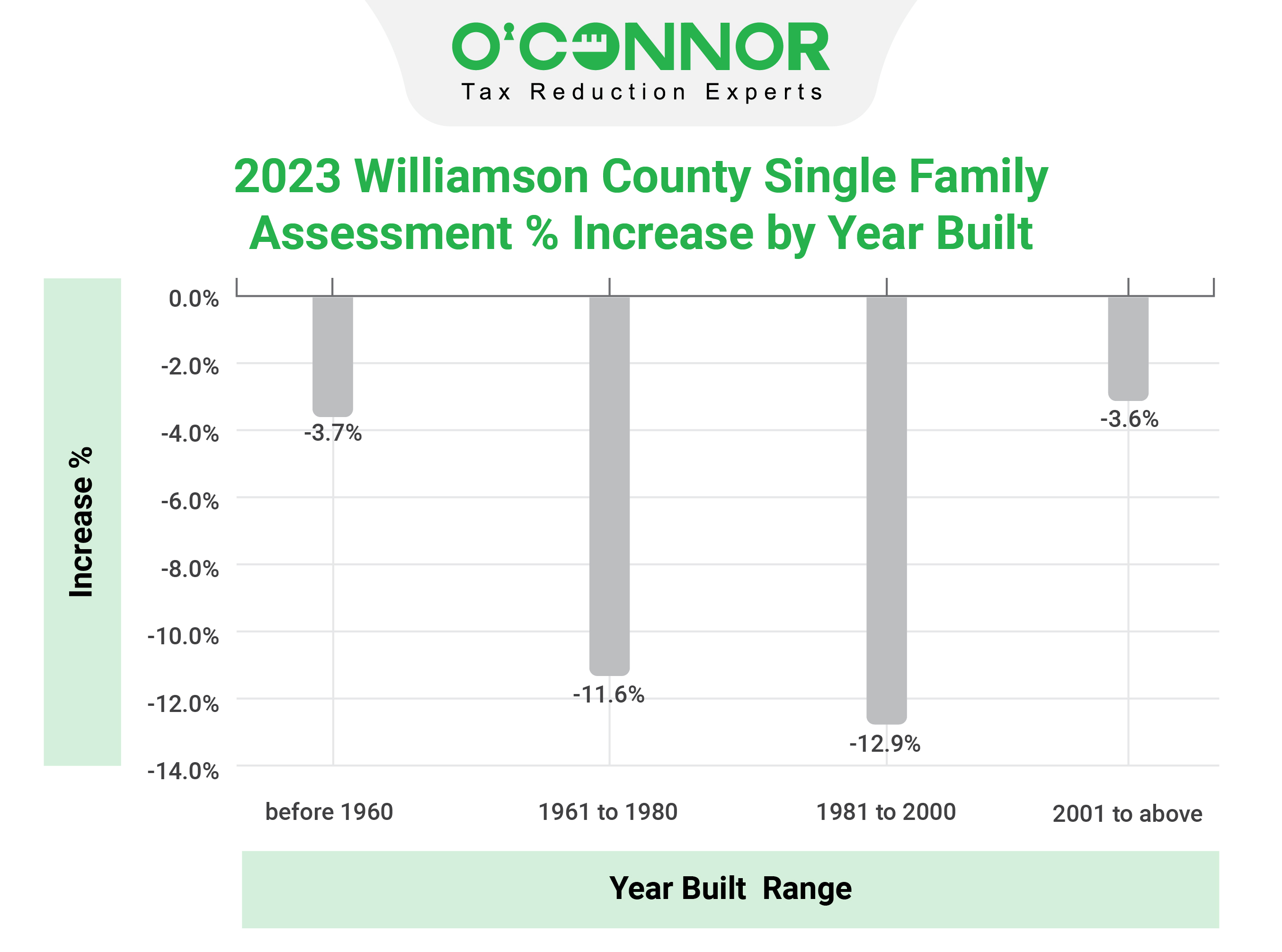Williamson County residential property assessment percentages dropped most significantly for property constructed between 1981 and 2000, with property built between 1961 and 1980, with the next largest drop in assessed value percentage.