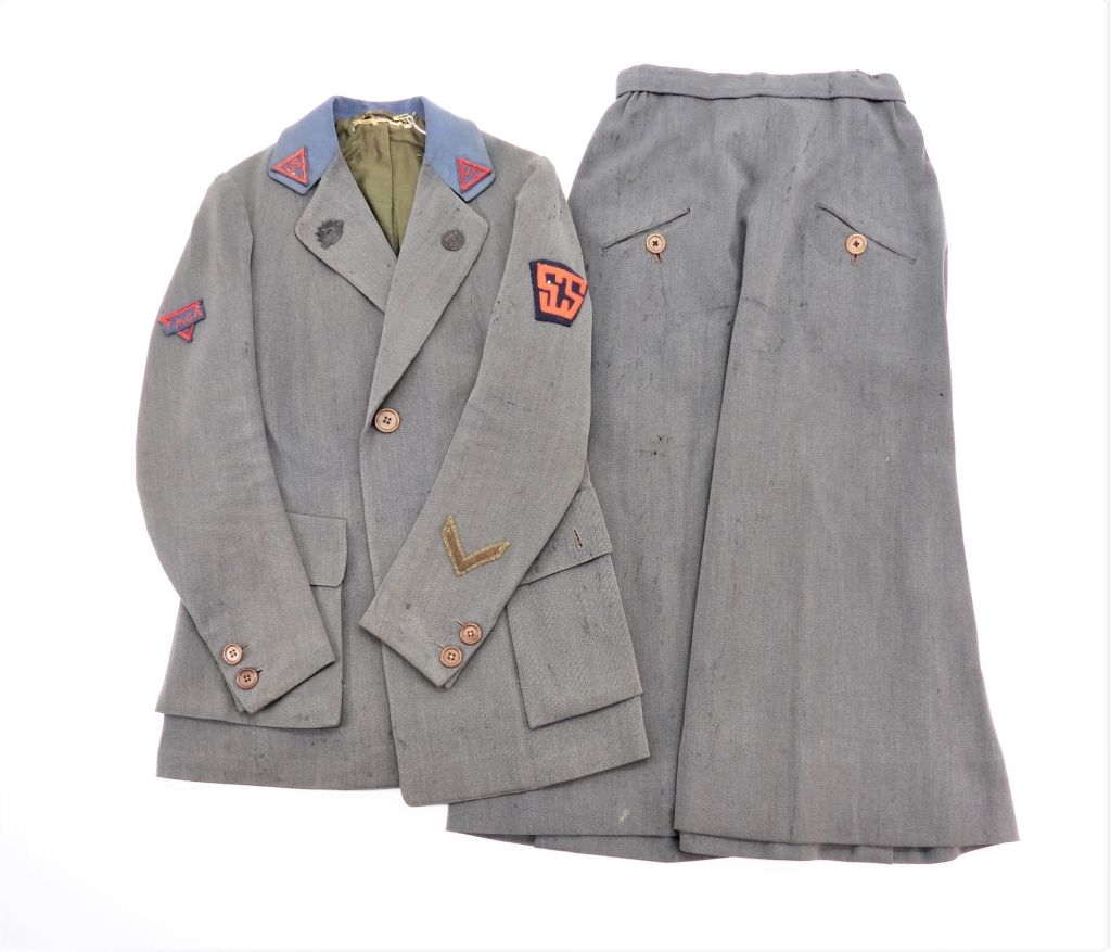 World War I ladies’ YMCA gray twilled woolen tunic with a red "US" on each sky-blue broadcloth collar and a skirt made of the same material as the tunic (est. $200-$300).