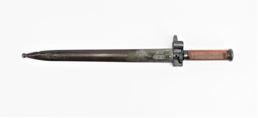 Circa 1935 Hungarian Model 1935 cavalry bayonet and scabbard, overall 18 ¾ inches (the blade 13 ¼ inches long), with a wooden grip, quadrangular blued blade and scabbard (est. $200-$300).