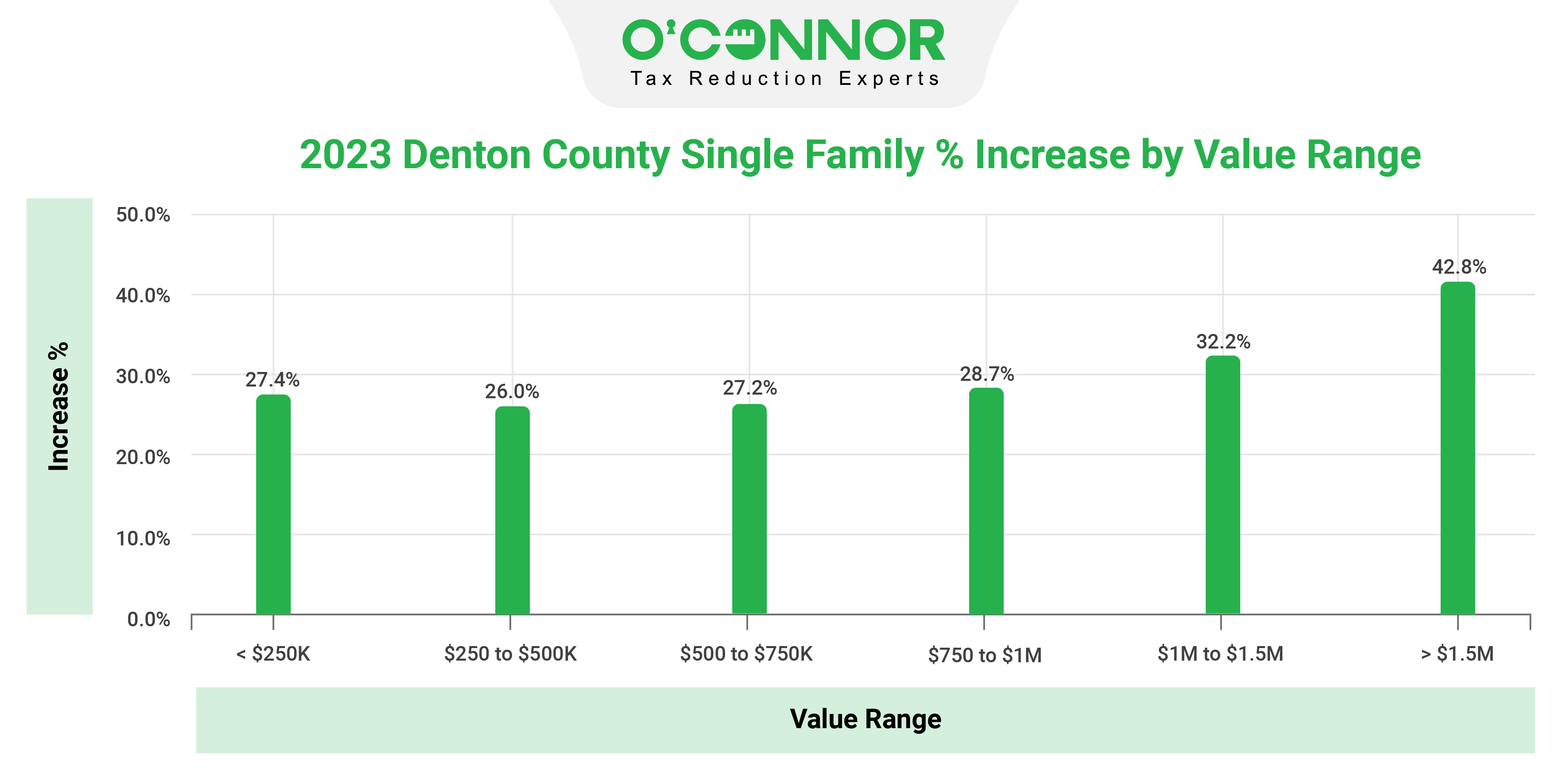 Denton County residential property over $1.5M have shown the sharpest increase in assessed value at 42.8%. Homes in Denton County with the greatest assessment increases are houses with between 6,000 to 7,999 sq. ft. at 39% increase and houses over 8,000 sq. ft. at more than 35% increase in assessed value. Denton County property owners with homes built since 2001 have a 31.9% rise in assessed value, the most among all ranges.