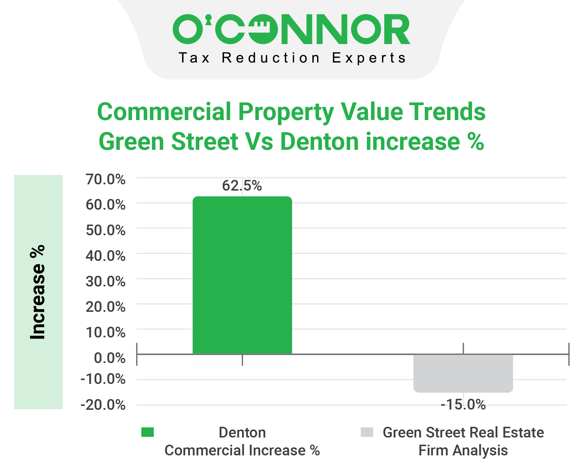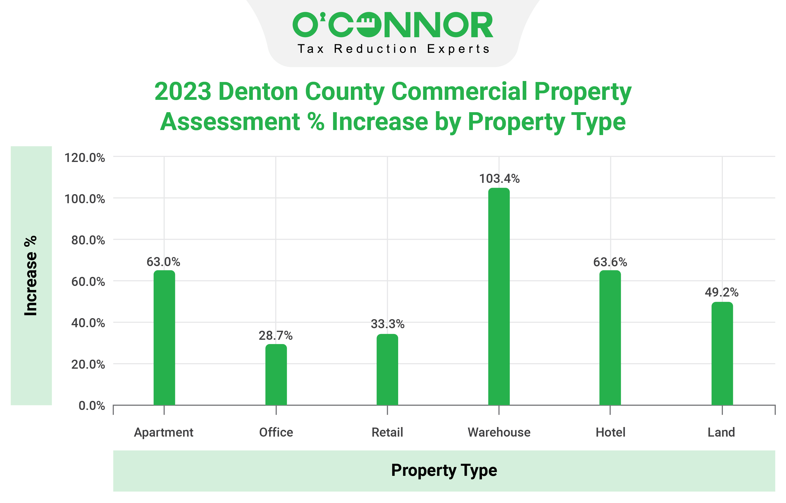 DALLAS, TEXAS, UNITED STATES, April 27, 2023/EINPresswire.com/ -- Denton County commercial property owners are in shock based on the 2023 tax assessments issued by Denton Central Appraisal District due to increases of over 60%! These large increases are incongruent with the large drop in commercial property values during 2022. A large increase in interest rates led to a large increase in cap rates, which caused commercial property sales to plummet by 70 to 80%. Buyers are keen to buy at a much lower price by sellers are on the sidelines until there is clarity regarding whether the higher cap rates are temporary or not.Warehouses suffered the largest increase in value (103.4% increase in 1 year) followed by hotels (63.6%) and apartments (63%).