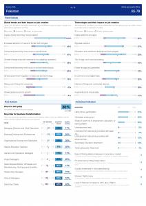The Report gives a comprehensive evaluation of Pakistan's performance and data related to the Future of Jobs in 2023 and how the job market will unfold in the next 5-7 years. The Report predicts that 23% of jobs are expected to change by 2027, with 69 million new jobs created and 83 million eliminated, and the green transition and localization of supply chains will lead to net job growth. The report estimates that cognitive skills such as analytical and creative thinking will be the most important for workers in 2023 and the next five years, and companies' skills strategies will focus on AI and big data specifically. The report also suggests that while reskilling and upskilling towards green skills is growing, it is not keeping pace with climate targets.