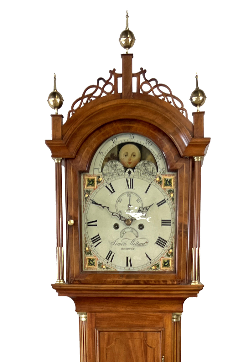 This Federal mahogany tall case clock by Simon Willard (Roxbury, Mass., circa 1790), having a bonnet with fine fretwork detail, should realize $10,000-$20,000.