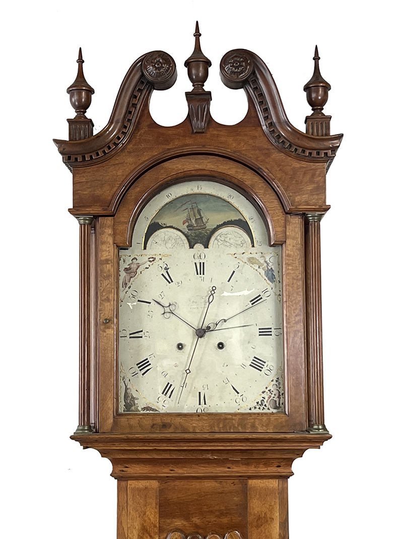 A strong candidate for top lot of the auction is the Lemuel Curtis (Concord, Mass., 1790-1857) girandole wall clock, named for its use of convex glass in the base section, patented by Curtis in 1816. This example is exceptional for its beautifully rendered image of Aurora in a reverse painting on glass (eglomisé), a very difficult technique. It should command $20,000-$40,000.