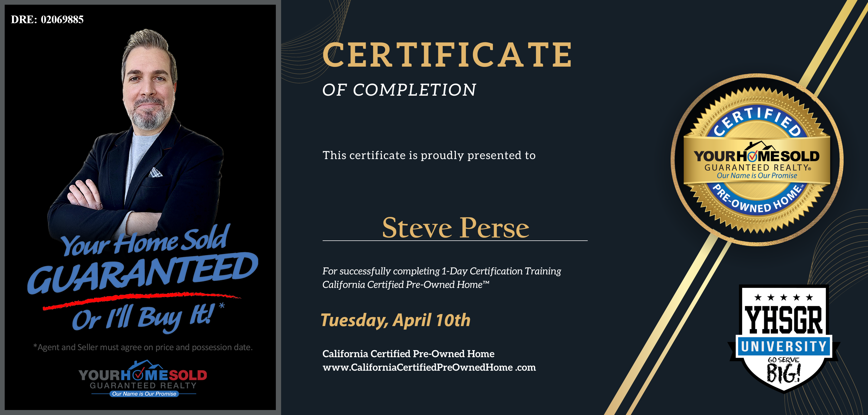 Steve Perse Completes Certified Pre-Owned Home™ Agent Certification at Your Home Sold Guaranteed Realty