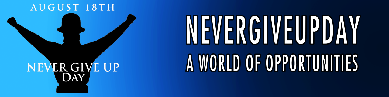 AUSTIN, TEXAS, UNITED STATES OF AMERICA, May 2, 2023/EINPresswire.com/ -- Never Give Up Day on August 18 is a global celebration day focused on cultivating a mindset of determination. The long-term well-being of society and the strength of our economy depend on people's ability to weather adversity. This celebration day highlights the efforts and courage of extraordinary people who simply refuse to give in to life's challenges. The interest that Never Give Up Day generates for its annual celebration is phenomenal. More than 80 cities in the US and Canada proclaim August 18th as Never Give Up Day. The media embraces Never Give Up Day with national and local print and in many parts of the country people flock online to spread the word of encouragement. This year Never Give Up Day is guaranteed 2400 media placements across 100 cities nationwide, reaching an audience of 190 million people in the US and Canada.