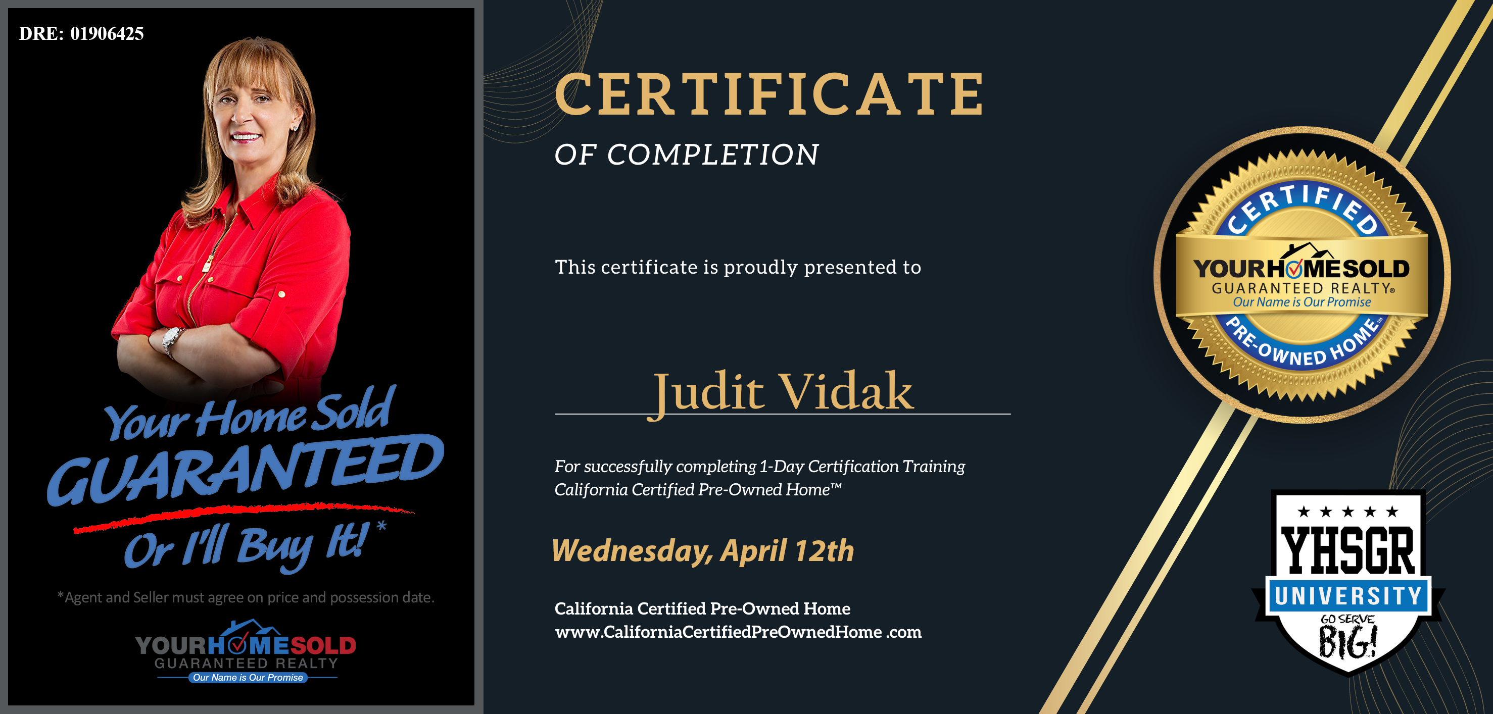 The Certified Pre-Owned Home™ certification will make it easier for Judit to sell homes quickly and with minimal hassle for both buyers and sellers. If you have any questions about searching for or selling a property, please feel free to contact Judit Vidak at Your Home Sold Guaranteed Realty.
