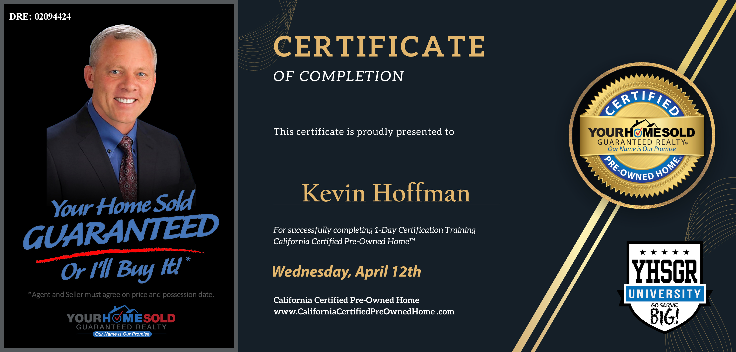 Your Home Sold Guaranteed Realty's Kevin Hoffman Completes Certified Pre-Owned Home™ (CPO) Agent Certification