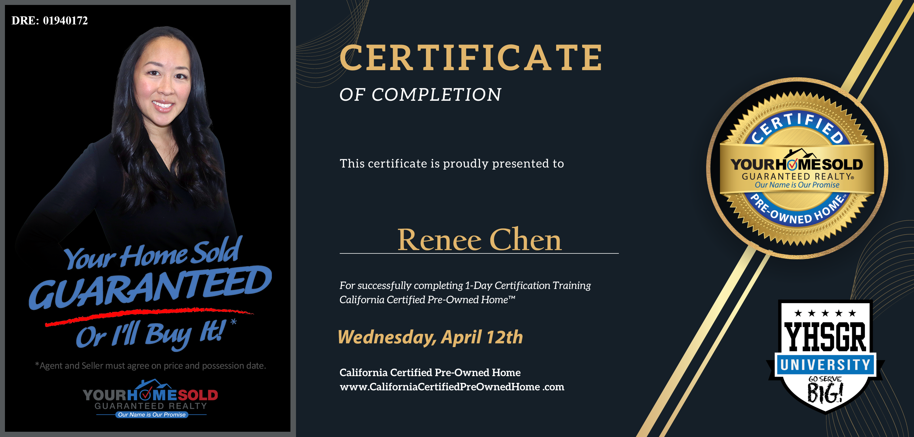 Your Home Sold Guaranteed Realty's Renee Chen Earns Certified Pre-Owned Home™ (CPO) Agent Certification