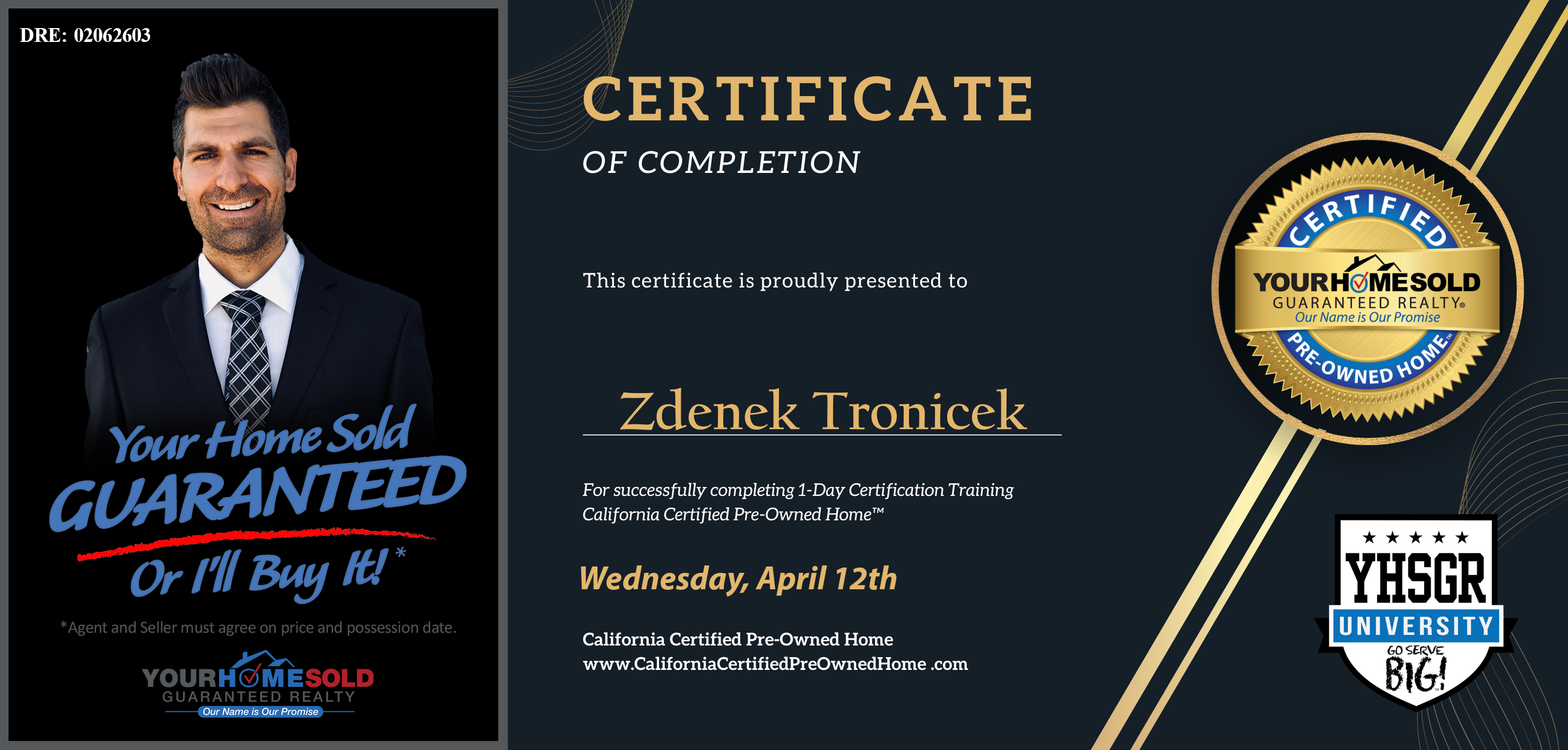 Zdenek Tronicek of YHSGR Earns Certified Pre-Owned Home™ (CPO) Agent Certification: A Solution for Home Seller and Buyer