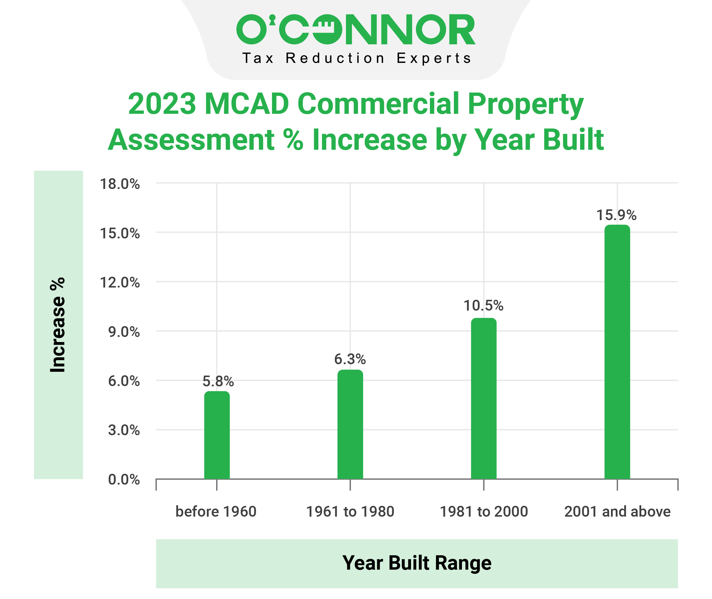 HOUSTON, TEXAS, UNITED STATES, May 4, 2023/EINPresswire.com/ -- Commercial property assessed values increased by 14%. However, commercial real estate valued fell by 20 to 30% during the last year due to higher interest rates / cap rates and higher expenses including insurance and property taxes. Apartment taxable values increased by 28.6% versus 36% for the eighteen counties analyzed.Commercial property owners in Montgomery County with property valued over $5M are forced to confront taxable values spiking by 16.2%. The most significant surge in commercial property assessment is seen in property constructed since 2001. Montgomery County apartment owners with properties constructed in 2001 and later are walloped with assessed values up 31.4%. While Montgomery County office property built between 1961 and 1980 saw a minor drop in assessed values, most commercial office property was up in assessed value, with offices built before 1960 having the heftiest growth by 10%. Retail property owners of buildings in Montgomery County constructed prior to 1960 increased by 8.3%. Warehouse property shows the most significant ascent for assessment values on property built in 2001 and later.