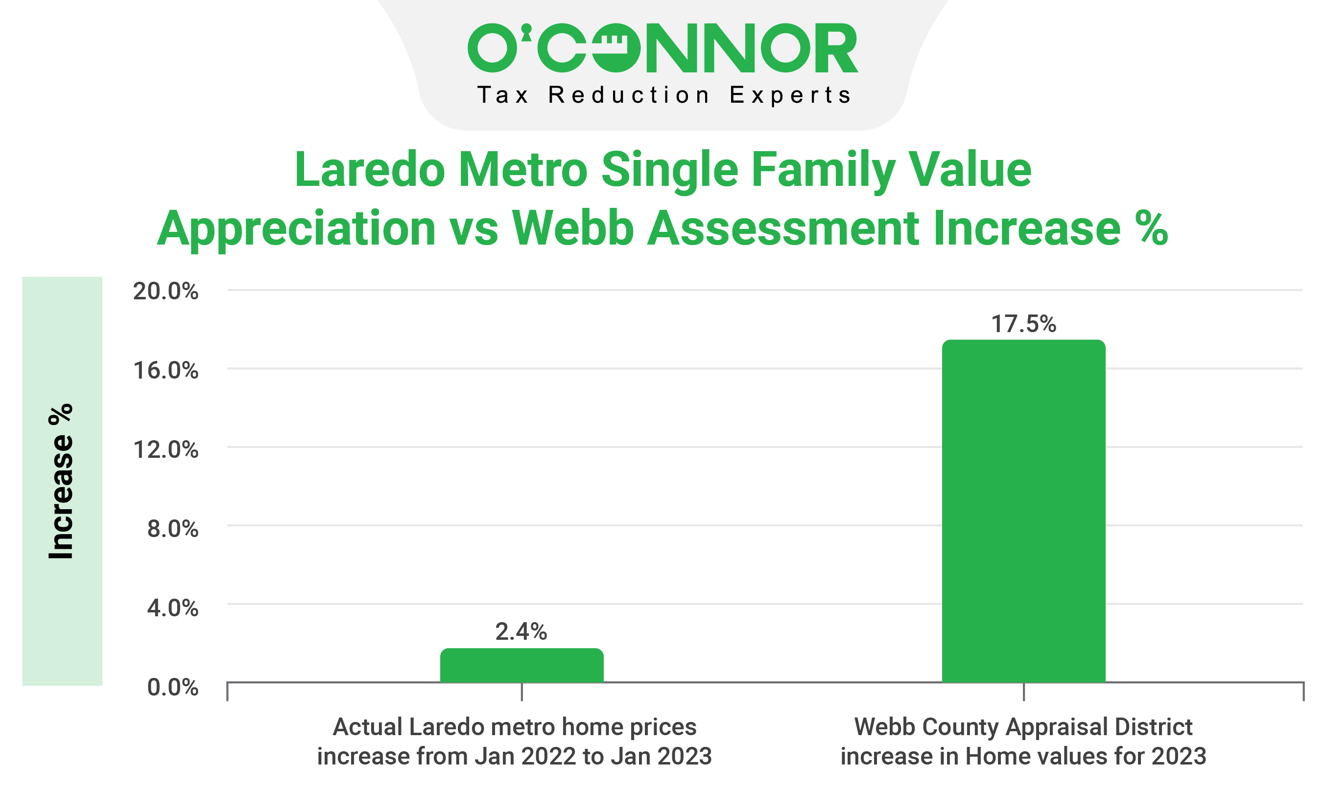 HOUSTON, TEXAS, UNITED STATES, May 9, 2023/EINPresswire.com/ -- Webb County homes are valued consistently with recent property sales. The median 2023 tax assessment is $205,688 versus a median time adjusted sales price of $201,450. The median level of assessment is 101.7% Stated differently, the typical home tax assessment exceeds the typical sales price by $4,238. The property taxes for $4,238 at 2.7% without exemptions would be $114.While it appears the Webb County Appraisal District is slightly high, the typical large Texas appraisal district that overshot market value, valued homes 8.7% higher than relevant home sales, based on an analysis by O’Connor of 1,640 Webb County home sales during January 2022 to March 2023.